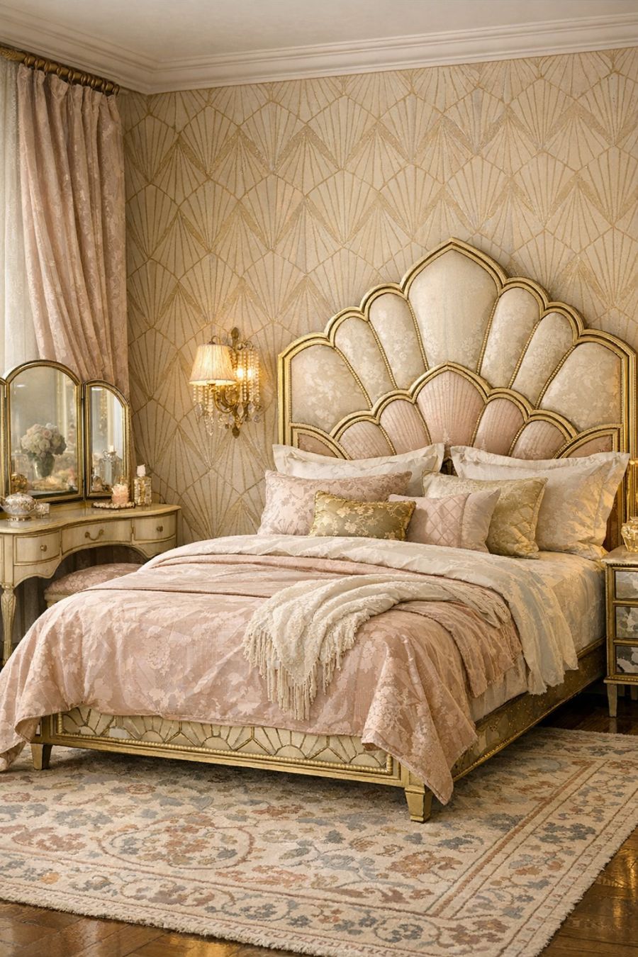 In the bedroom, tranquility reigns supreme, with a soothing palette of soft pastels and muted golds. The Art Deco influence is evident in the geometric patterns of the wallpaper and the ornate bedframe that stands as the room's centerpiece. Rich textiles, from the plush area rug to the heavy drapes, add layers of comfort and style. A vintage vanity, with its elegantly curved lines, offers a space for reflection and preparation, completing the room's blend of luxury and serenity.