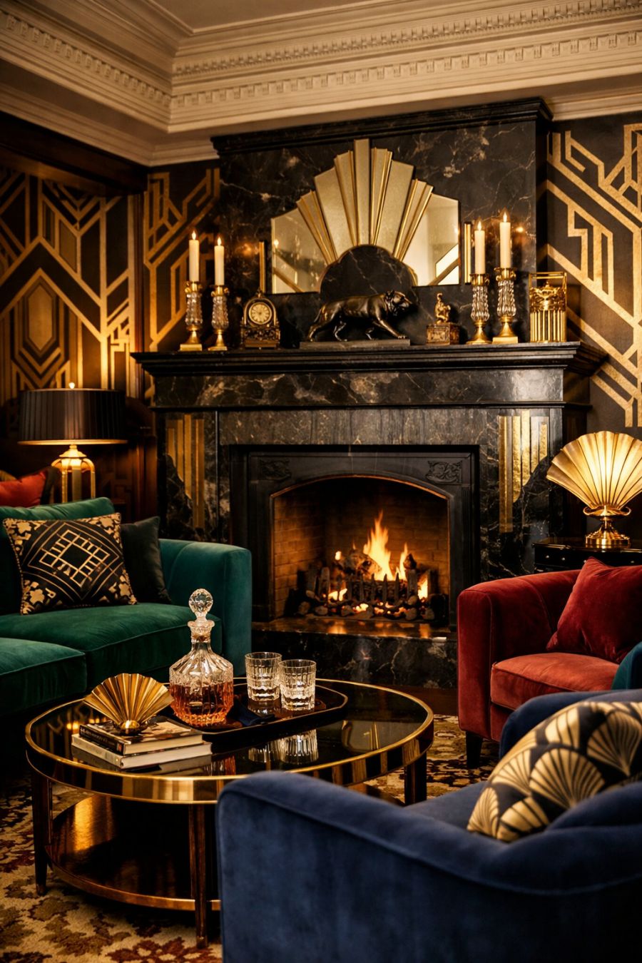 Stepping into the living area, one is immediately struck by the contrast to the cottage's exterior. The room is an homage to the elegance of the 1920s Art Deco style, with geometric patterns adorning the walls and intricate gold accents catching the light at every turn. Plush, velvet-upholstered furniture in rich jewel tones invites relaxation, while a grand fireplace serves as the focal point, its mantel adorned with period-specific decor. The ceiling, with its elaborate moldings, adds a layer of sophistication, making this a space that both welcomes and impresses.