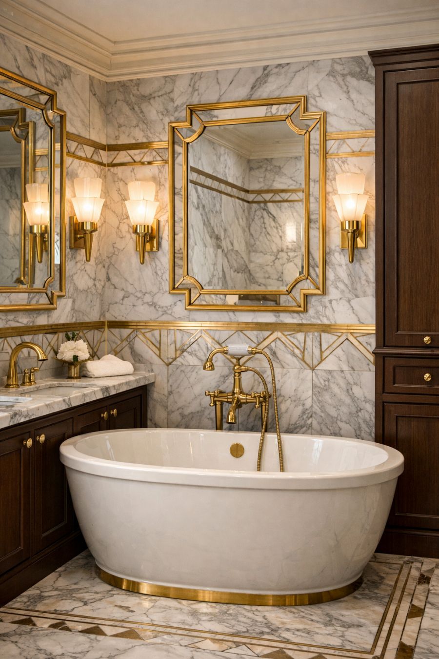 The bathroom is a sanctuary of sophistication, with marble surfaces that glisten under the soft glow of Art Deco sconces. The geometric patterns continue here, etched into the tiles and echoed in the gilt-edged mirrors. A freestanding bathtub invites indulgence, while brass fixtures and fittings add a touch of timeless elegance. The layout is both functional and stylish, with ample storage hidden behind beautifully crafted cabinetry, ensuring that the space remains as practical as it is breathtaking.