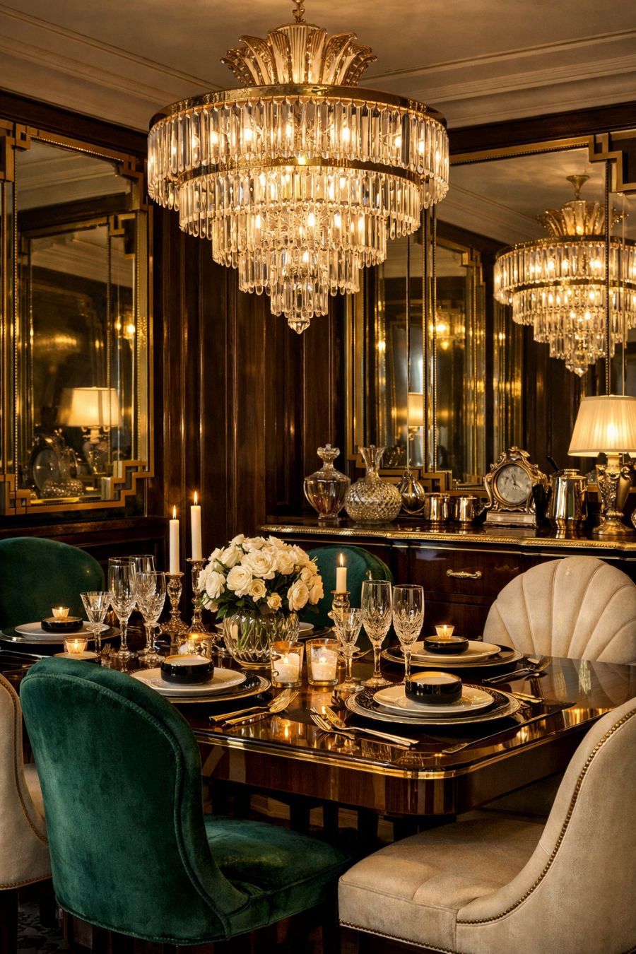 The dining area continues the theme of Art Deco opulence, with a lavish table set beneath an ornate chandelier that casts a warm, inviting glow. The walls are lined with mirrors framed in gold, reflecting the light and giving the illusion of a grander space. Elegant dining chairs, upholstered in lush fabrics, surround the table, which is set for an intimate gathering. A sideboard, with its sleek lines and polished finish, offers both style and functionality, housing fine china and glassware that echo the 1920s aesthetic.