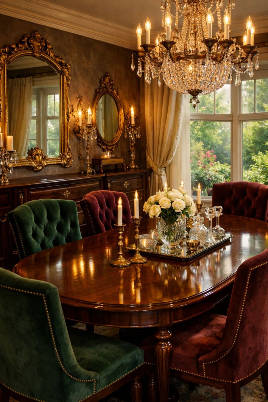 The dining area continues the theme of 1920s grandeur with a stunning mahogany table as its centerpiece. Surrounding it are plush velvet chairs that promise comfort during long, lavish dinners. The walls are adorned with vintage mirrors and gold accents, reflecting light and adding depth to the room. A large bay window offers a picturesque view of the garden outside, ensuring that every meal is accompanied by natural beauty. This space is designed for both intimate gatherings and grand celebrations, a true reflection of timeless elegance.