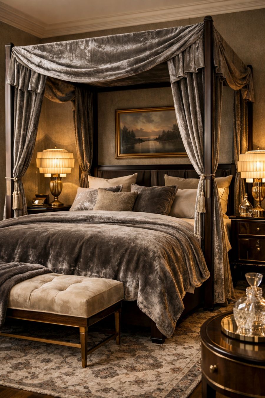 The bedroom offers a serene escape, enveloped in muted tones and luxurious textures. A four-poster bed, draped in sumptuous velvet, serves as the room's focal point. Art Deco-inspired lamps cast a soft, ambient light, creating an atmosphere of relaxation and indulgence. The walls are adorned with tasteful artwork, and a plush area rug adds warmth and comfort underfoot. This space is designed for rest and rejuvenation, a personal retreat that harks back to an era of refined luxury.