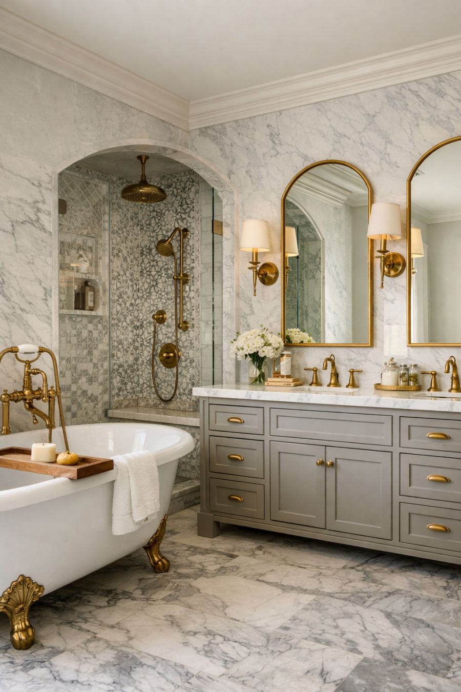 The bathroom is a sanctuary of elegance and functionality, featuring a harmonious blend of classic and contemporary design elements. Cool marble surfaces are paired with warm brass fixtures, creating a sophisticated contrast. The centerpiece is a freestanding clawfoot tub, perfect for unwinding after a long day. A walk-in shower with intricate mosaic tiles offers a modern touch, while the double vanity provides ample space with its stylish yet practical design. This bathroom is a testament to the idea that utility and beauty can coexist seamlessly.