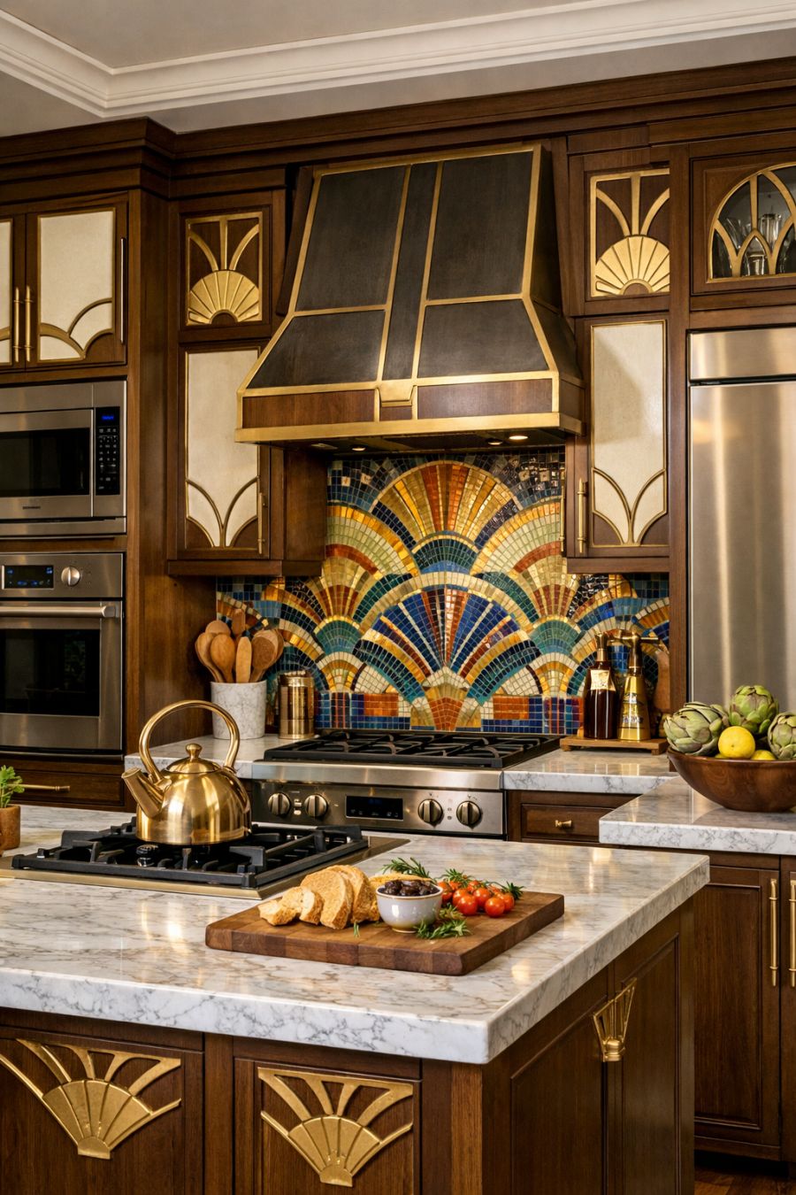 The kitchen is a seamless blend of modern functionality and vintage style. Sleek marble countertops provide ample workspace, while custom cabinetry features intricate Art Deco details. State-of-the-art appliances are cleverly integrated into the design, ensuring that the kitchen is as efficient as it is beautiful. A mosaic tile backsplash adds a touch of artistry, its bold colors and patterns a nod to the home's overall aesthetic. This kitchen is a chef's dream, where every meal is crafted with flair and finesse.
