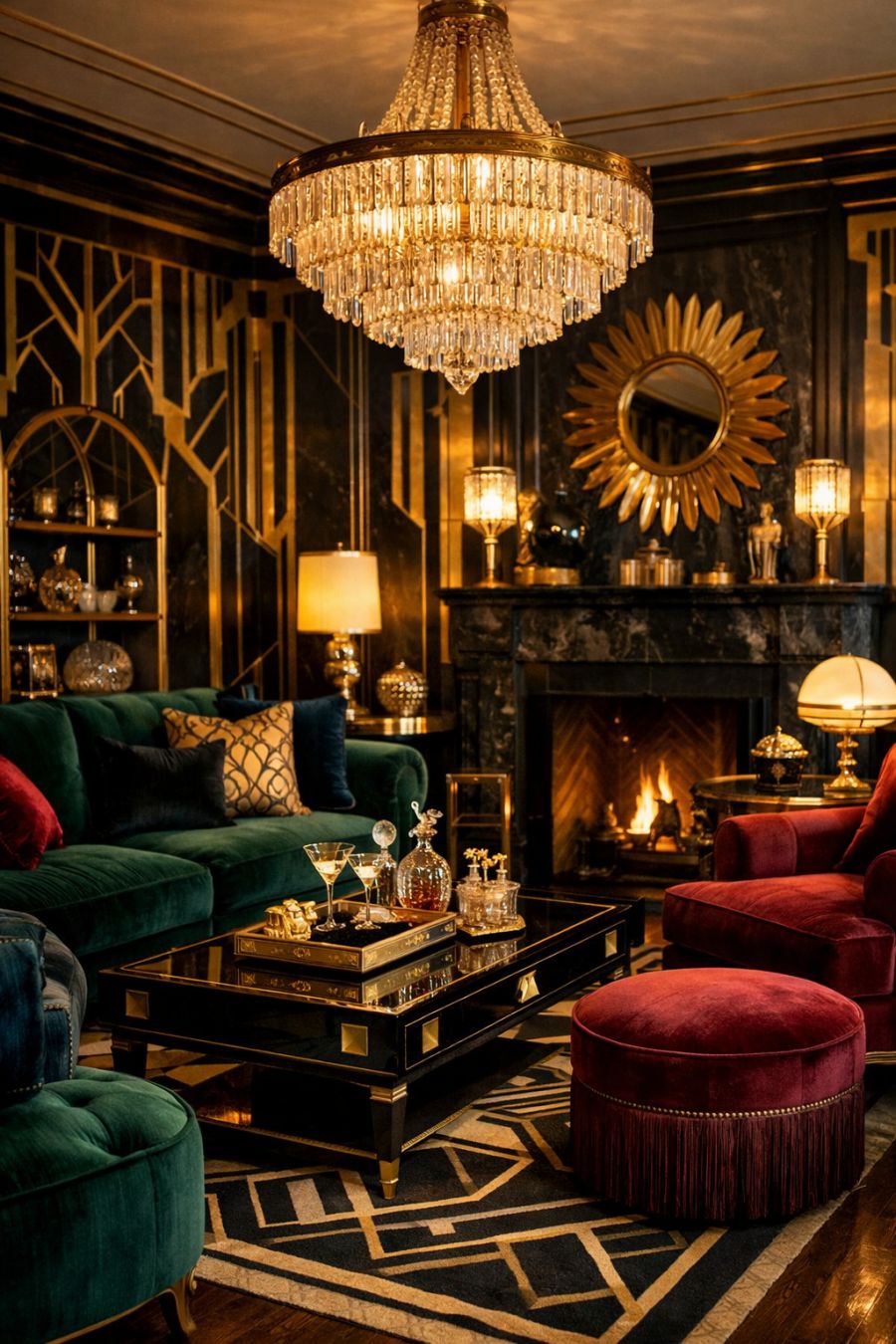Step inside, and you'll find yourself transported to a glamorous era of glitz and glamour. The living area is a tribute to the gilded 1920s, with Art Deco influences evident in every detail. Velvet furnishings in rich jewel tones invite relaxation, while geometric patterns adorn the walls, echoing the luxurious motifs of the past. A grand chandelier hangs from the ceiling, casting a warm glow that enhances the opulence of the space. The room is an elegant juxtaposition of comfort and style, a place where time seems to stand still.