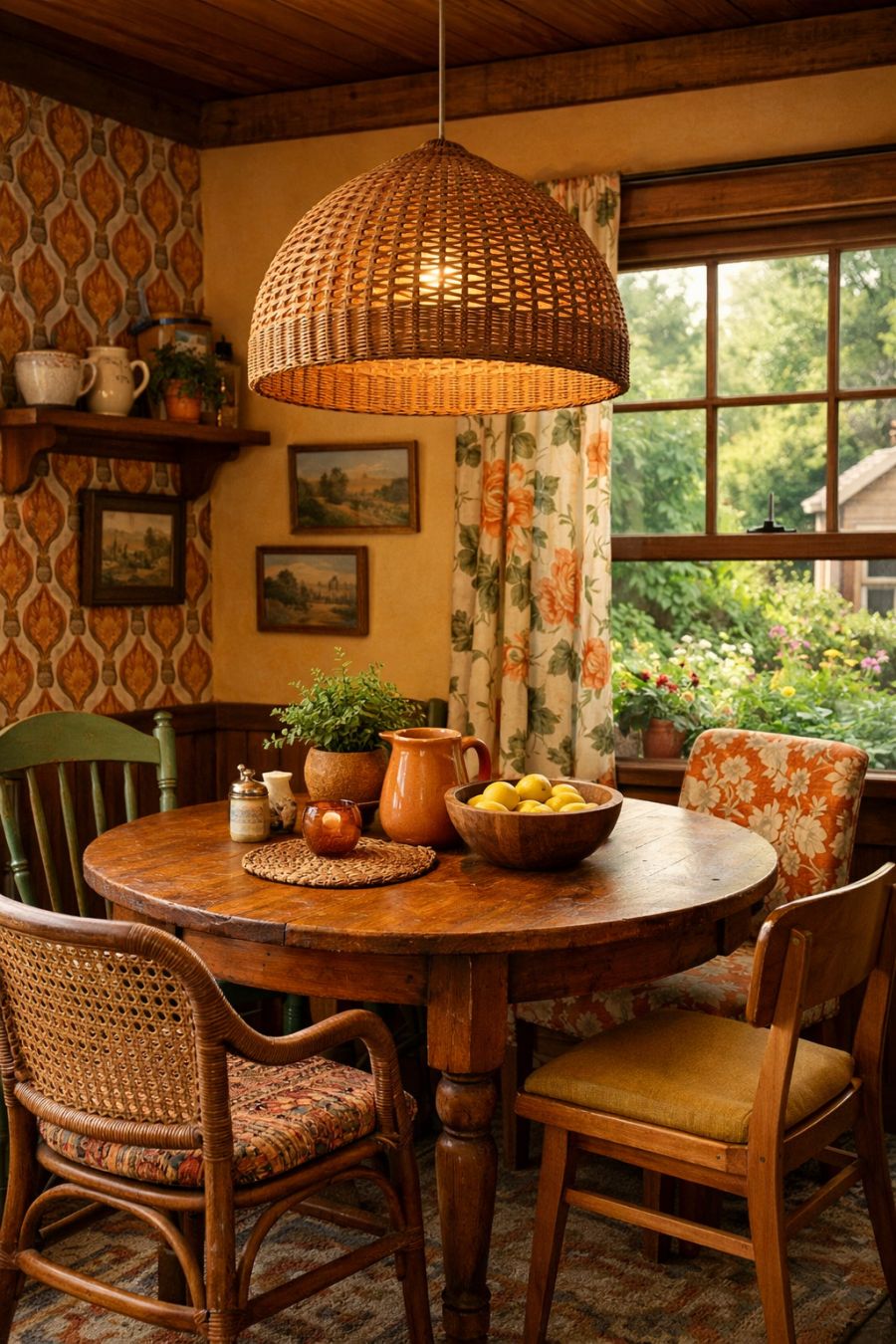 The dining area continues the retro theme with a mix of bold patterns and natural materials. A round, wooden dining table is surrounded by mismatched vintage chairs, each with its own unique character. Overhead, a statement pendant light made from woven rattan casts intricate shadows across the room. The walls are painted in a warm, inviting hue, and a large window offers views of the lush garden outside, creating a seamless connection between the interior and the outdoor scenery.