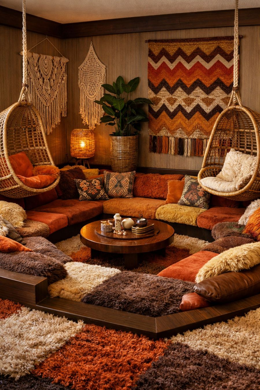 Upon entering, the living area greets you with a vivid contrast to the home's traditional exterior. This space is a 1970s bohemian dream, complete with a sunken conversation pit that invites gatherings and leisurely lounging. Plush shag rugs in rich earthy tones cover the floor, providing warmth and texture. Hanging rattan chairs sway gently, adding a playful, whimsical element to the room, while the walls are adorned with macramé art and colorful woven tapestries that enhance the groovy ambiance.