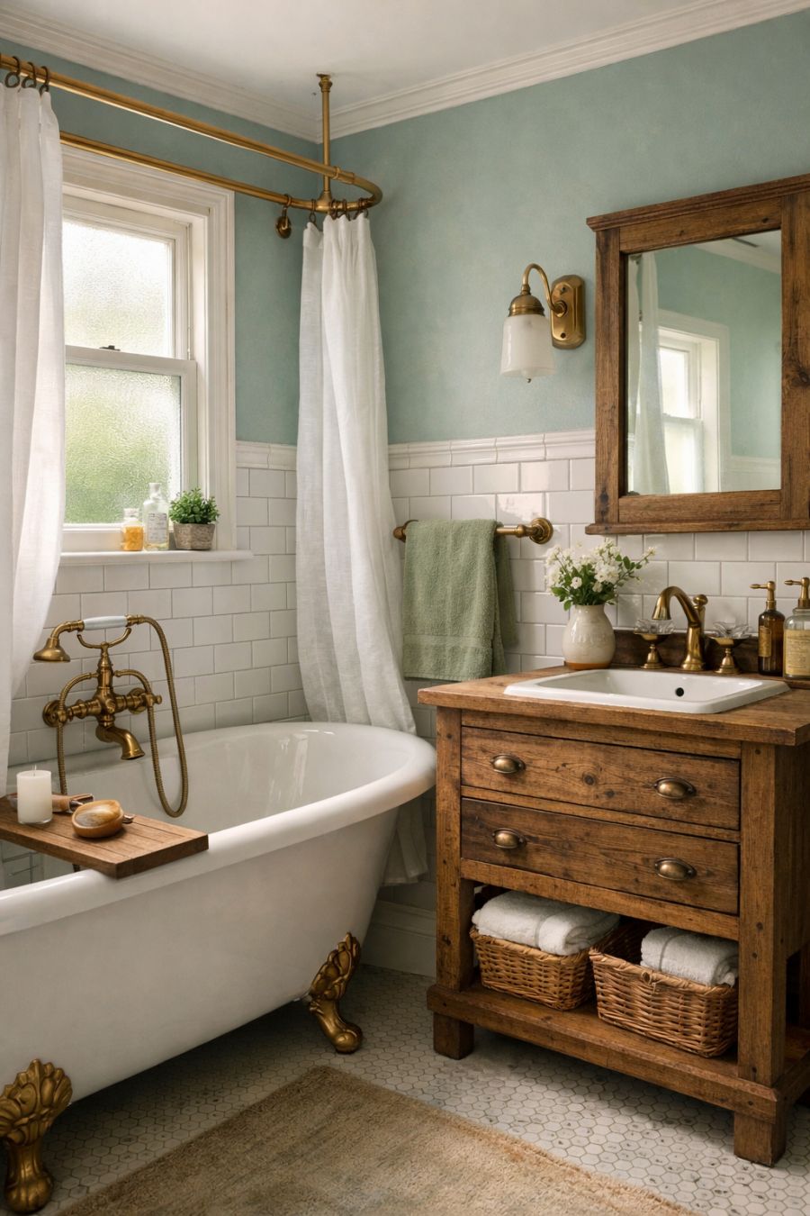 The bathroom is a harmonious blend of vintage charm and modern convenience. The space features classic subway tiles in a crisp white, paired with a clawfoot bathtub that invites relaxation. Brass fixtures add a touch of elegance, while the vanity, crafted from reclaimed wood, offers both storage and style. The color scheme is a soothing combination of soft blues and greens, enhanced by the natural light that streams through a frosted window, creating a tranquil, spa-like environment.