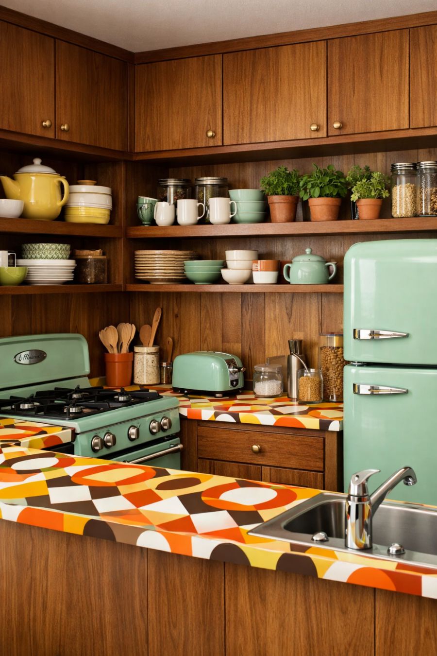 In the kitchen, the design blends functionality with retro charm. The space features sleek, wood-paneled cabinetry that offers ample storage while maintaining a clean, uncluttered look. The countertops are a striking laminate with a bold geometric pattern, adding a pop of color to the room. Vintage-inspired appliances in a soft, mint green hue complement the overall aesthetic, while open shelving displays a curated collection of ceramic dishware and potted herbs, infusing the kitchen with a sense of homeliness and warmth.