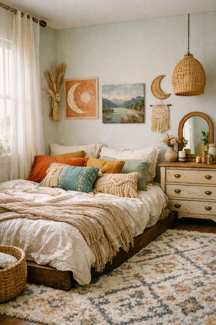 The bedroom is a serene retreat that combines bohemian elements with cozy comforts. A low platform bed is adorned with layers of soft, textured linens and an array of colorful throw pillows. The walls are painted in a calming pastel shade, providing a soothing backdrop for the eclectic mix of artwork and decorative pieces. Natural light filters through sheer curtains, creating a peaceful atmosphere, while a vintage-inspired dresser and a plush area rug complete the room’s inviting aesthetic.