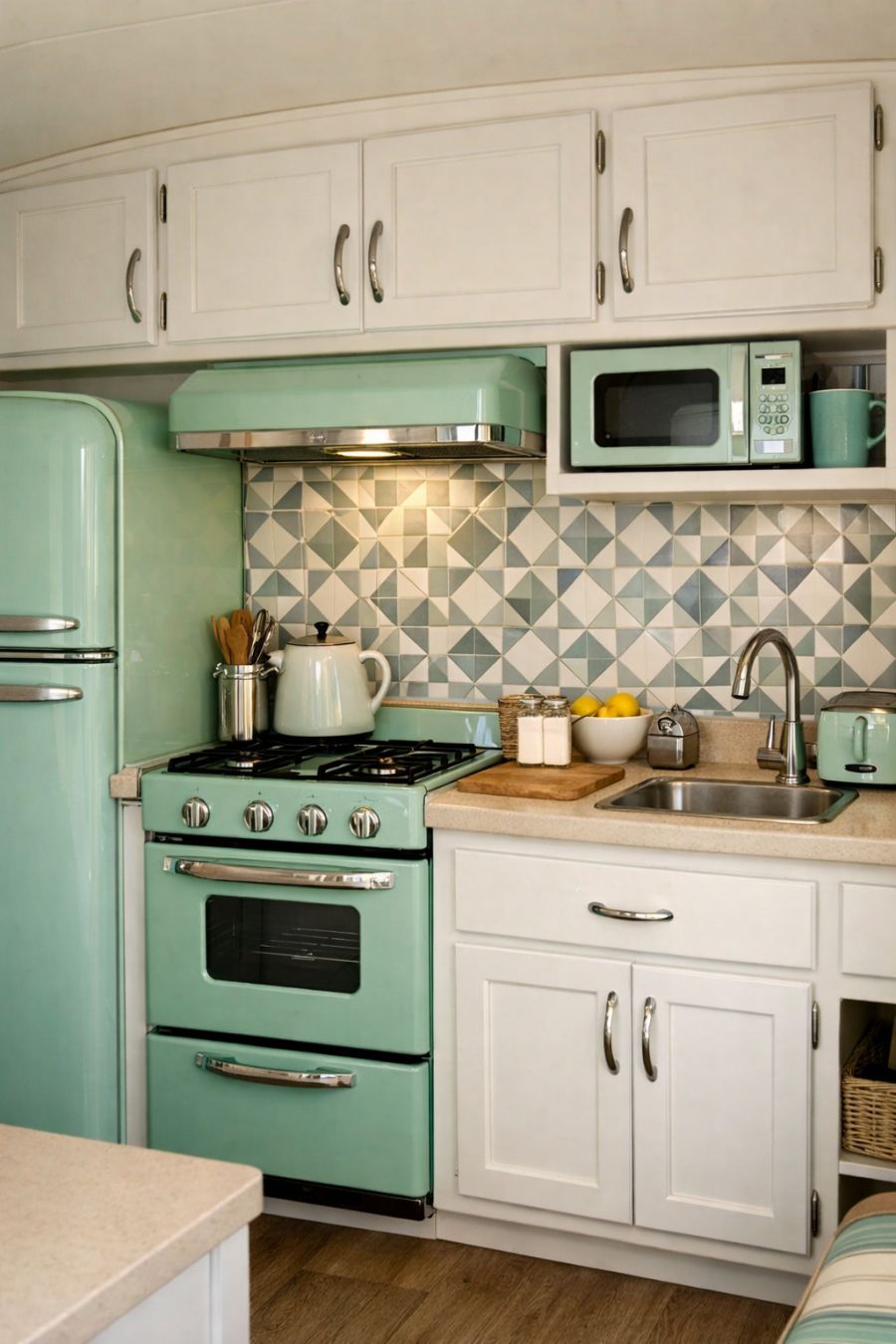 The kitchen area of this vintage camper is a model of efficiency and style, with retro appliances in a soft, pastel hue that tie in seamlessly with the overall design. White cabinetry with classic hardware provides ample storage, while a small countertop offers just enough space for meal prep. The backsplash features a charming, geometric tile pattern, adding a touch of modern flair to the classic setting. Cleverly designed to maximize every inch, the kitchen ensures that cooking on the go remains a delightful experience.