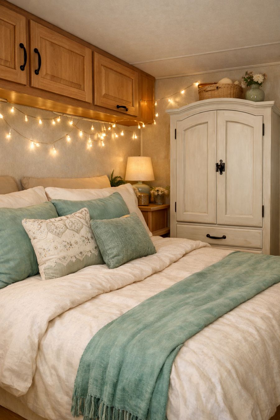 The bedroom area is a serene retreat, featuring a cozy bed that invites rest and relaxation. Soft linens in complementary hues of seafoam green and ivory create a soothing environment, while decorative pillows add a hint of luxury. A small, vintage-style wardrobe provides storage for clothing and personal items, ensuring that everything has its place. The walls are adorned with delicate string lights, casting a gentle glow that enhances the tranquil ambiance of this snug space.