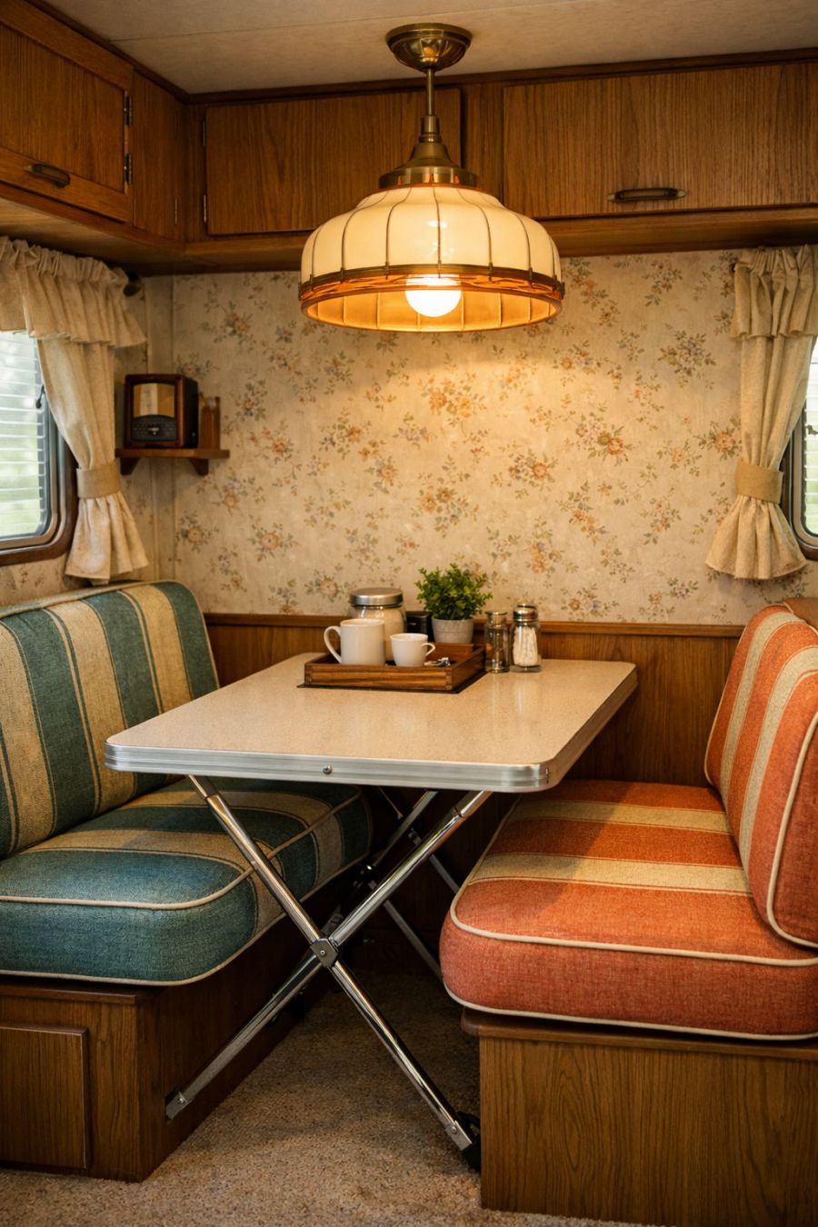 The dining area of the camper is a charming nook that cleverly utilizes limited space for maximum functionality. A small, foldable table is surrounded by vintage-style chairs, upholstered in a fabric that echoes the camper's color scheme. The walls feature subtle, floral-patterned wallpaper, adding depth and interest to the cozy space. Overhead, a retro pendant lamp casts a warm glow, inviting you to sit and enjoy a meal or engage in conversation. Despite its compact size, the dining area feels welcoming and intimate, perfect for shared moments on the road.