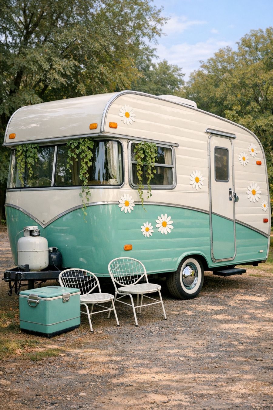 The exterior of this vintage RV camper is a captivating blend of seafoam green and ivory, providing a refreshing yet classic look. Painted daisy decals adorn the surface, adding a playful and cheerful vibe to the camper's appearance. Trailing ivy cascades gently from the glass windows, giving the vehicle an organic touch that complements its retro aesthetic. Nestled beside the camper, a small retro metal cooler and white wire garden chairs complete the tableau, suggesting a leisurely outdoor experience. Photographed from a 3/4 angle, the camper exudes charm and character, making it an inviting sight for all who pass by.