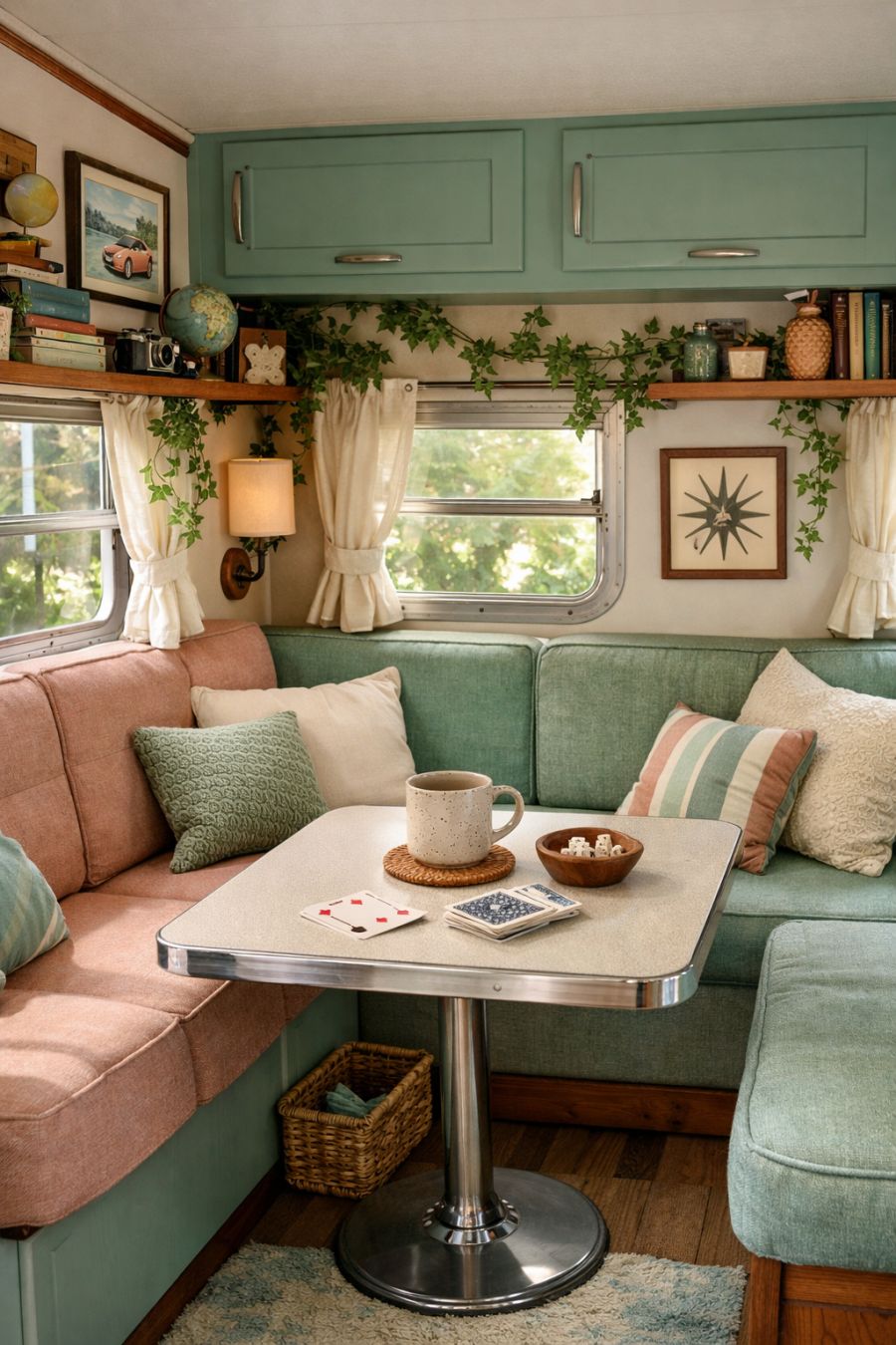 The living area of this vintage camper is a cozy haven, bathed in soft, natural light that filters through the windows festooned with trailing ivy. Plush seating upholstered in muted pastels complements the seafoam green and ivory theme, offering a comfortable space to relax. The walls are adorned with retro-inspired artwork and shelving that displays an eclectic mix of books and trinkets, creating a personal and inviting atmosphere. A small, multi-functional table sits in the center, perfect for enjoying a cup of coffee or engaging in a game of cards.