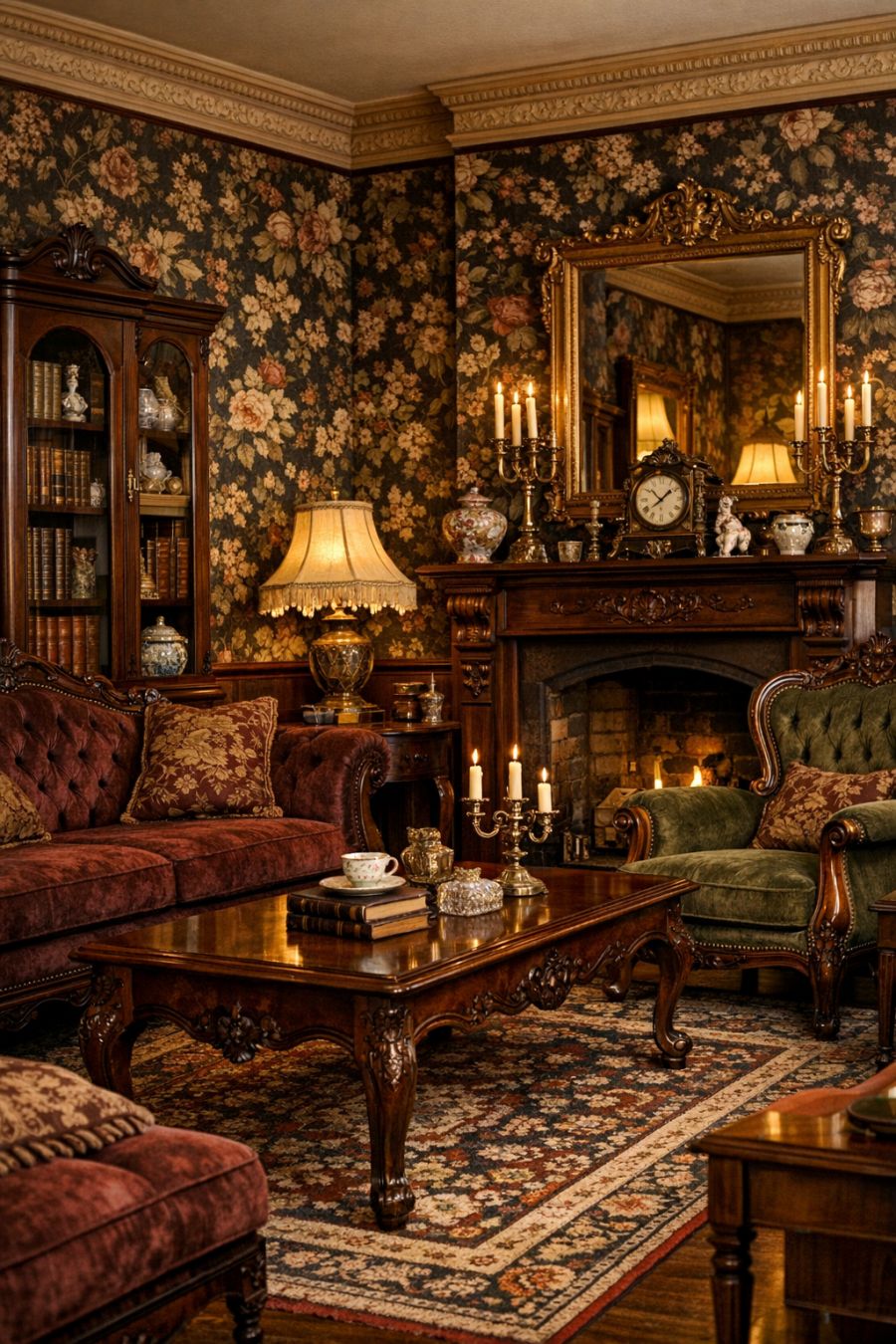 Stepping into the living area, one is immediately enveloped in the ornate elegance of the Victorian era. Dark floral wallpaper adorns the walls, creating a dramatic and cozy atmosphere. Heavy mahogany antiques are strategically placed, each piece telling its own story and adding to the layered history of the room. Richly upholstered sofas and armchairs provide sumptuous seating, inviting guests to linger and admire the intricate woodwork and decorative moldings that frame this space.