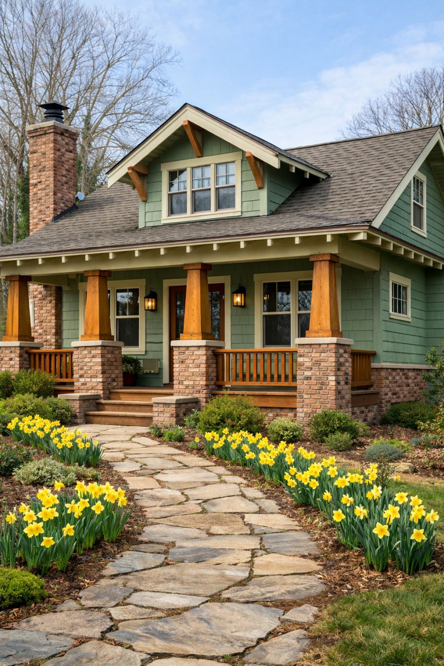 The exterior of the house is a picturesque embodiment of craftsman charm. Painted in a tranquil sage green, the brickwork exudes a timeless appeal, harmonizing effortlessly with the natural surroundings. The natural wood tapered columns, resting proudly on robust brick pedestals, add a touch of rustic warmth to the façade. Wide overhanging eaves create a sense of shelter and comfort, while the early March daffodils blooming along the stone walkway provide a cheerful splash of color, inviting visitors to step inside this enchanting abode.