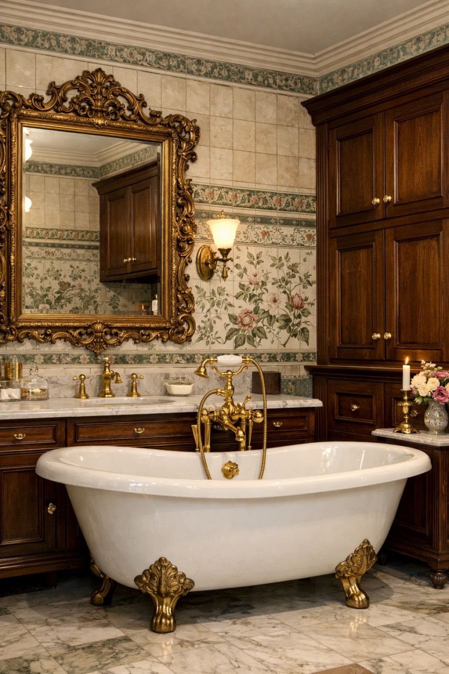 The bathroom is a masterpiece of Victorian design, featuring a freestanding clawfoot tub as its centerpiece. The walls are adorned with intricate floral tiles, echoing the home's overall theme. Marble countertops and brass fixtures provide both elegance and practicality, while a large, ornately framed mirror enhances the sense of space. The layout is both functional and stylish, with ample storage hidden behind beautifully crafted wooden cabinetry, ensuring that the room remains as tidy as it is luxurious.