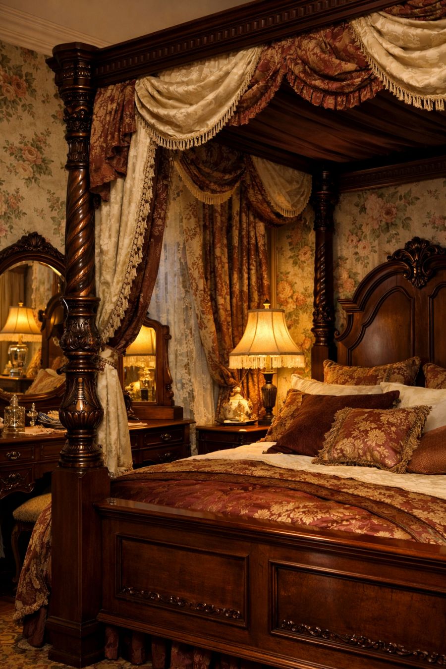 The bedroom is a sanctuary of Victorian luxury, with a four-poster mahogany bed as the focal point. Draped in rich fabrics, the bed invites restful slumber, while floral wallpaper and heavy curtains continue to create a cohesive aesthetic. An antique vanity and wardrobe provide both function and style, their intricate carvings and polished finishes contributing to the room's opulent atmosphere. Soft lighting from period-appropriate lamps adds a gentle ambiance, perfect for unwinding at the end of the day.