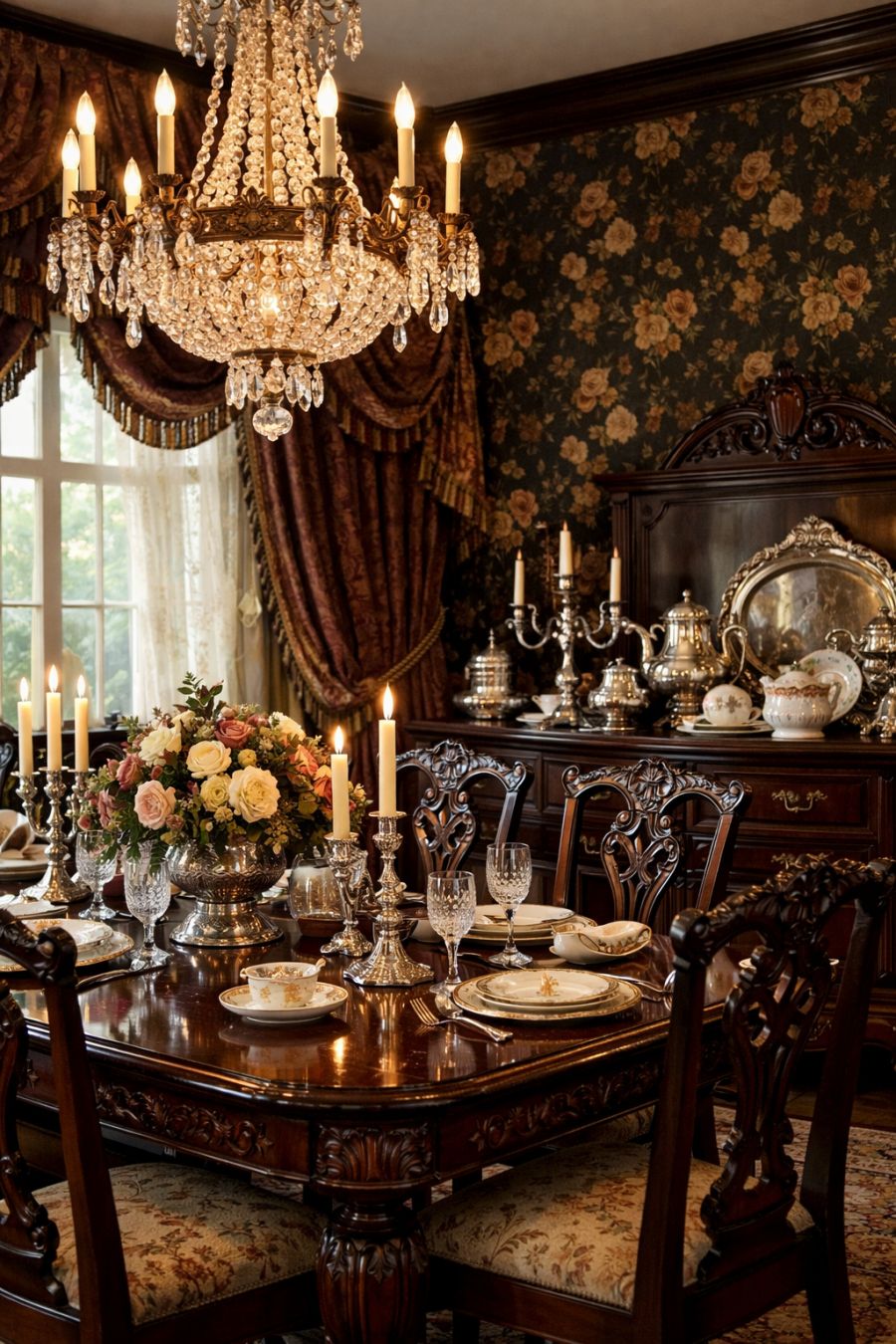 The dining area continues the Victorian theme, with an imposing mahogany dining table serving as the room's centerpiece. Surrounded by intricately carved chairs, the table is set beneath a crystal chandelier that casts a warm, inviting glow over the room. Dark floral wallpaper continues here, complemented by heavy drapes that frame large windows, allowing for natural light to accentuate the richness of the materials. A sideboard laden with antique silverware and delicate china adds an extra layer of sophistication to the dining experience.