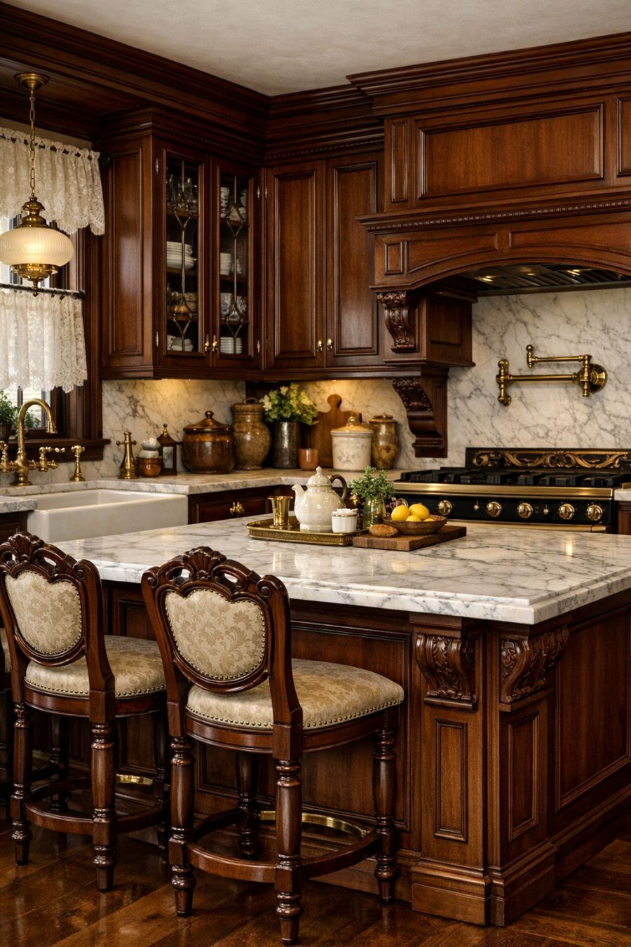 In the kitchen, the Victorian influence is seamlessly integrated with modern functionality. Custom mahogany cabinetry offers ample storage, while marble countertops provide a durable and elegant workspace. Antique brass fixtures adorn the sink and stove, adding to the historical authenticity of the room. A large central island serves not only as a practical preparation area but also a gathering spot for family and friends, surrounded by high-backed stools that echo the design of the dining chairs.