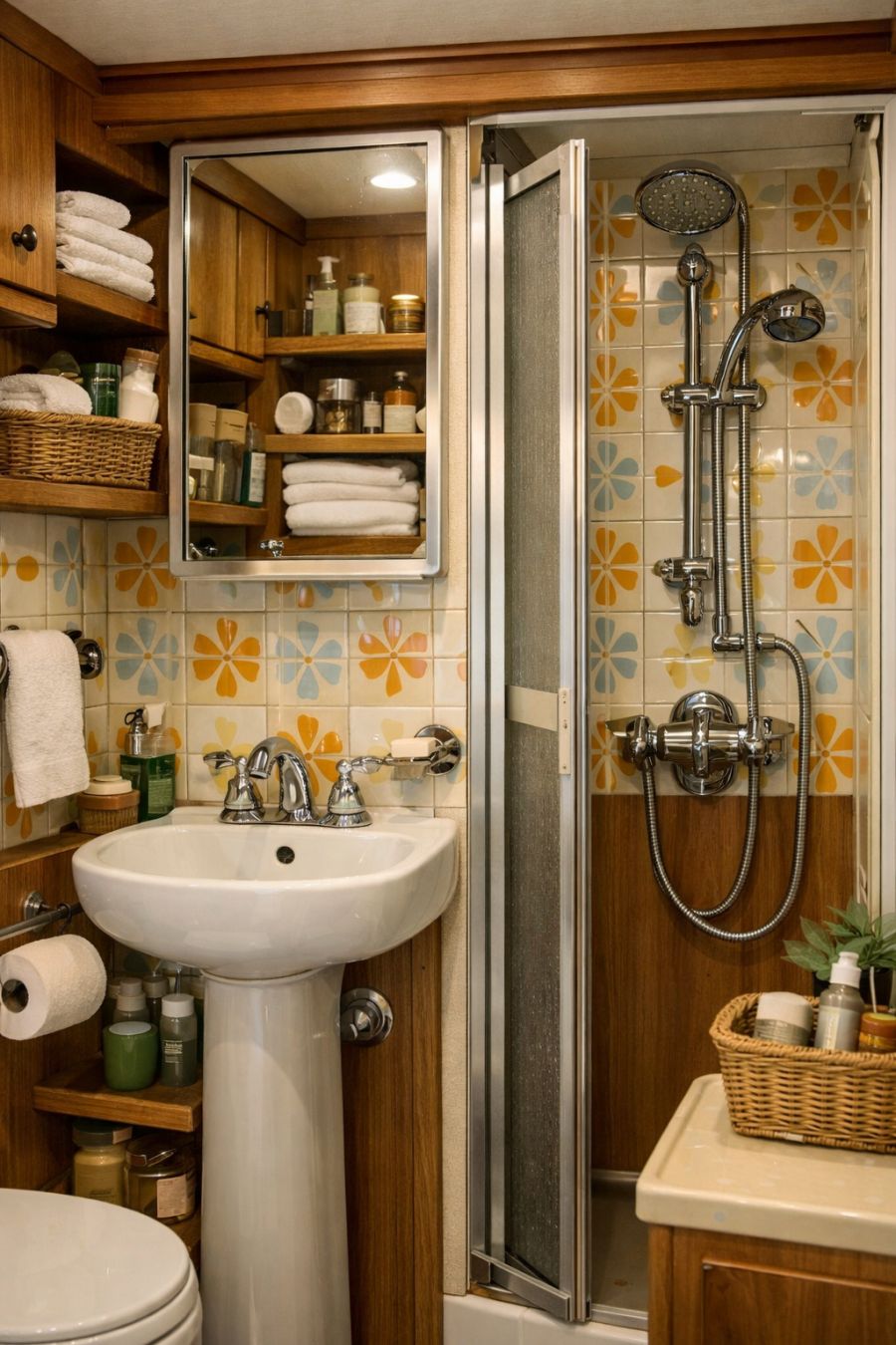 The bathroom in this vintage RV camper is a study in compact, efficient design. The walls are adorned with retro tiles in cheerful hues, creating a lively yet serene ambiance. A small, pedestal sink is paired with chrome fixtures, adding a touch of classic elegance to the space. The shower is cleverly designed to maximize space without sacrificing comfort, featuring a vintage-inspired showerhead and a folding door for privacy. A combination of open shelving and a mirrored cabinet provides ample storage for toiletries, ensuring functionality without compromising on style.
