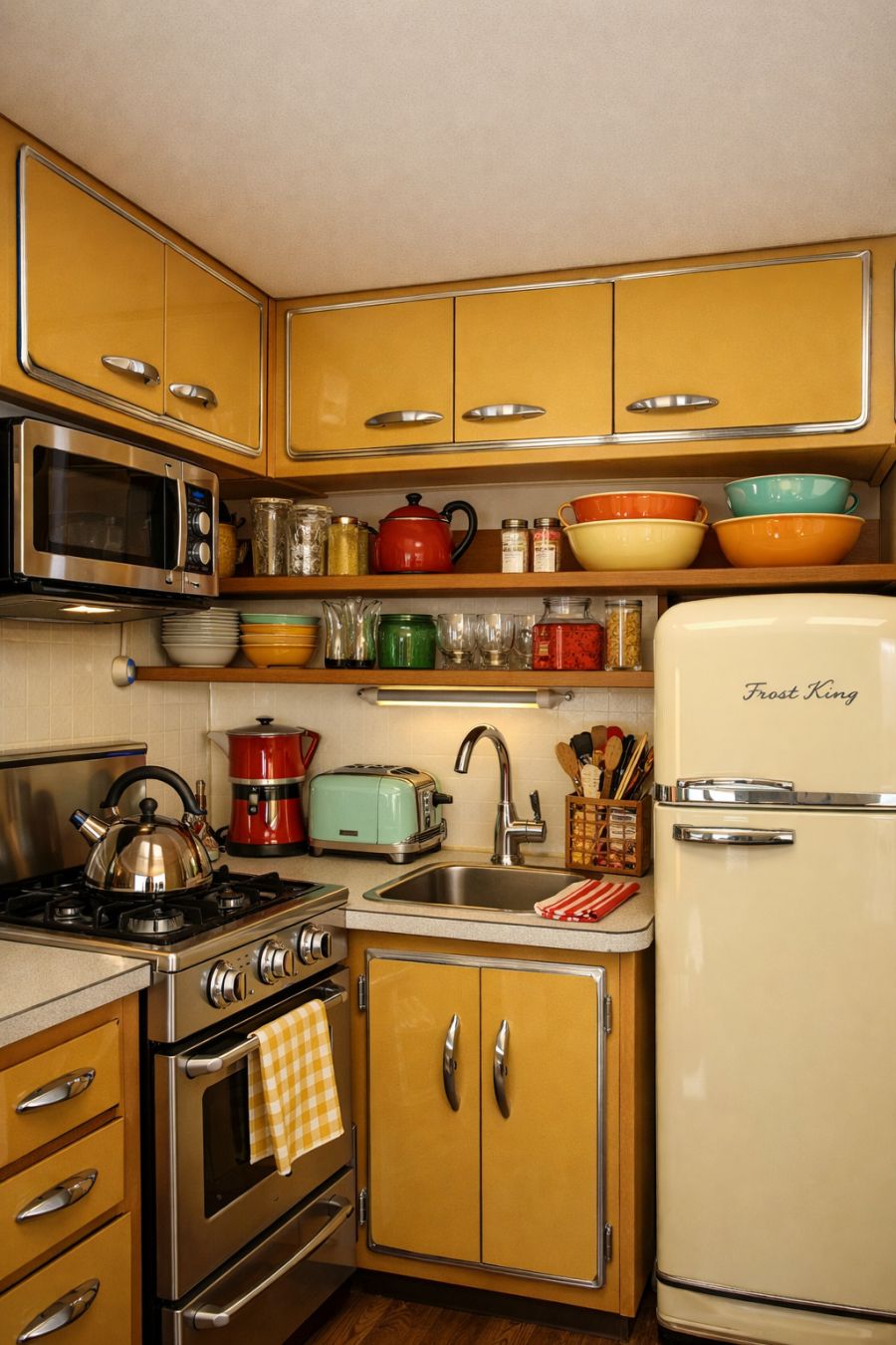 The kitchen area, though compact, is a masterclass in retro design efficiency. With its mustard yellow cabinetry and chrome accents, it strikes a perfect balance between style and functionality. The countertops are a sleek laminate, reminiscent of the era's design trends, and the appliances, though modern in function, boast vintage aesthetics. Open shelving displays colorful cookware and vintage glassware, adding both practicality and charm. It's a space where preparing meals feels like a nostalgic nod to the past while enjoying the conveniences of today.