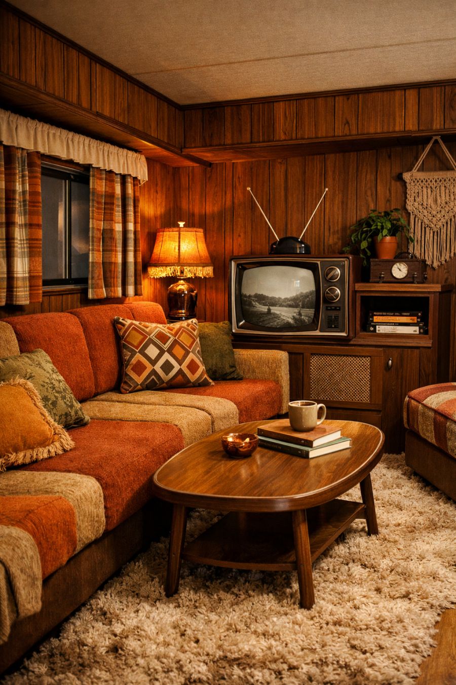 Step inside the living area, and you're greeted with a cozy, retro-inspired space that invites relaxation. The interior is adorned with earthy tones and plush seating, creating a warm and welcoming atmosphere. Vintage patterns and textures are seamlessly integrated, from the geometric throw pillows to the shag carpet beneath your feet. The walls are lined with wood paneling, echoing the exterior's design, and a small, retro-style television sits snugly in the corner, perfect for enjoying classic films on a quiet evening.