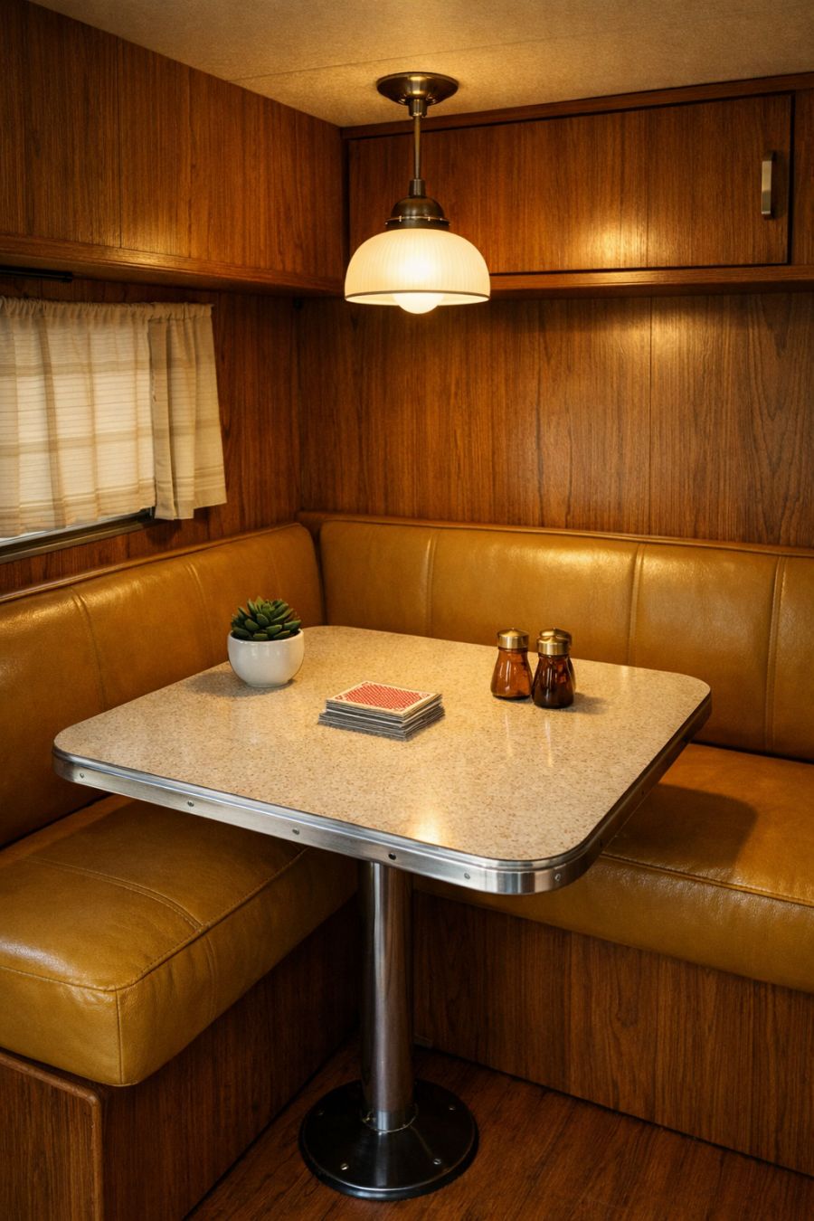 The dining area is a charming nod to mid-century design, featuring a compact, built-in booth with mustard-colored upholstery. The table, with its smooth, Formica surface, is ideal for meals or card games, and the surrounding wood paneling enhances the vintage vibe. Overhead, a small pendant light casts a warm glow, creating an intimate setting for dining. The clever use of space ensures that even in this compact environment, there's room for style and functionality, making every meal feel special.