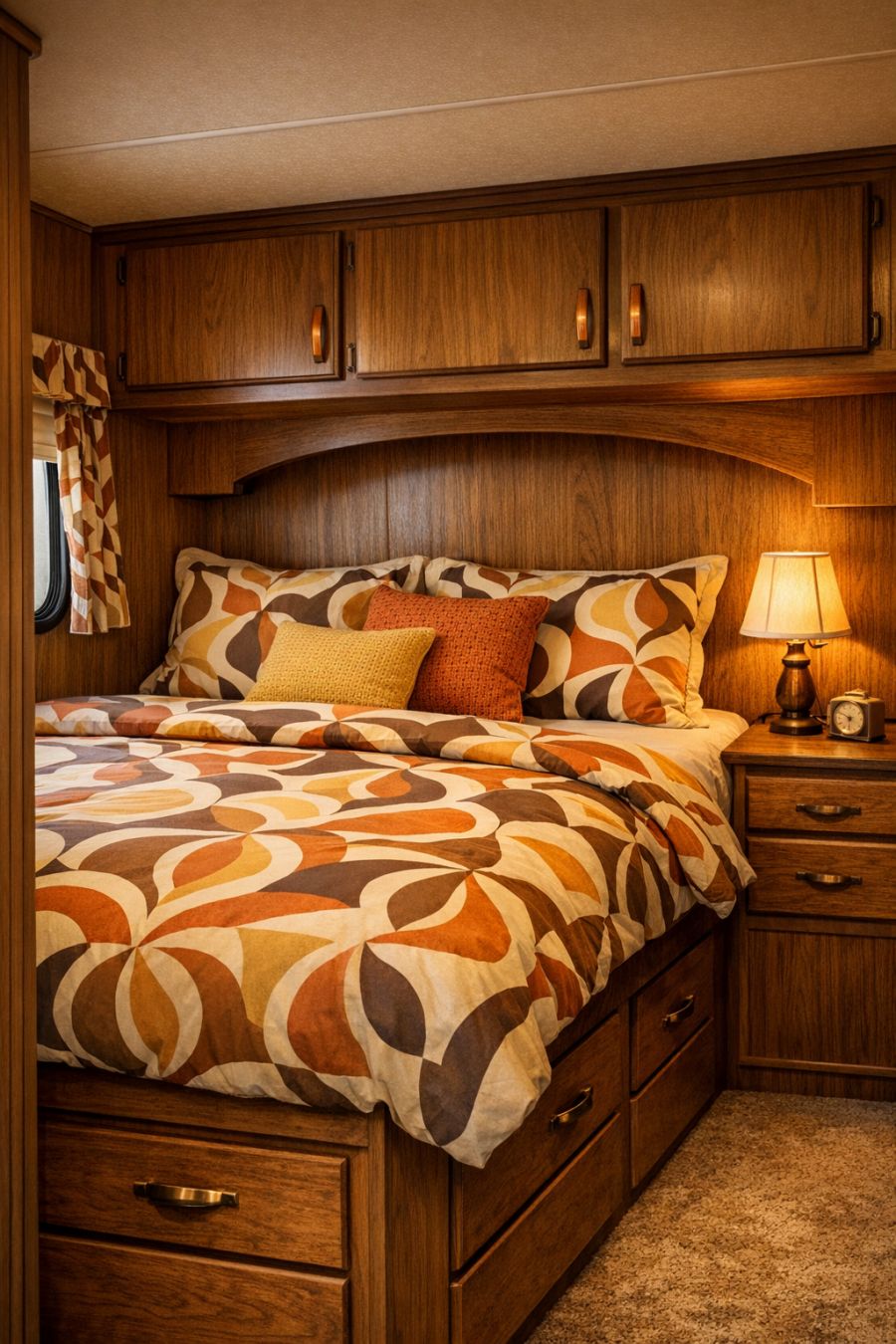 The bedroom area is a cozy retreat, designed with relaxation in mind. The bed is adorned with a plush, patterned duvet that echoes the retro theme, complemented by a set of matching throw pillows. A small, vintage-inspired lamp sits on the built-in nightstand, casting a soft, calming light. The wood-paneled walls continue into this space, creating a seamless transition from the rest of the camper. Clever storage solutions, such as under-bed drawers and overhead cabinets, ensure that everything has its place, maintaining a clutter-free environment.