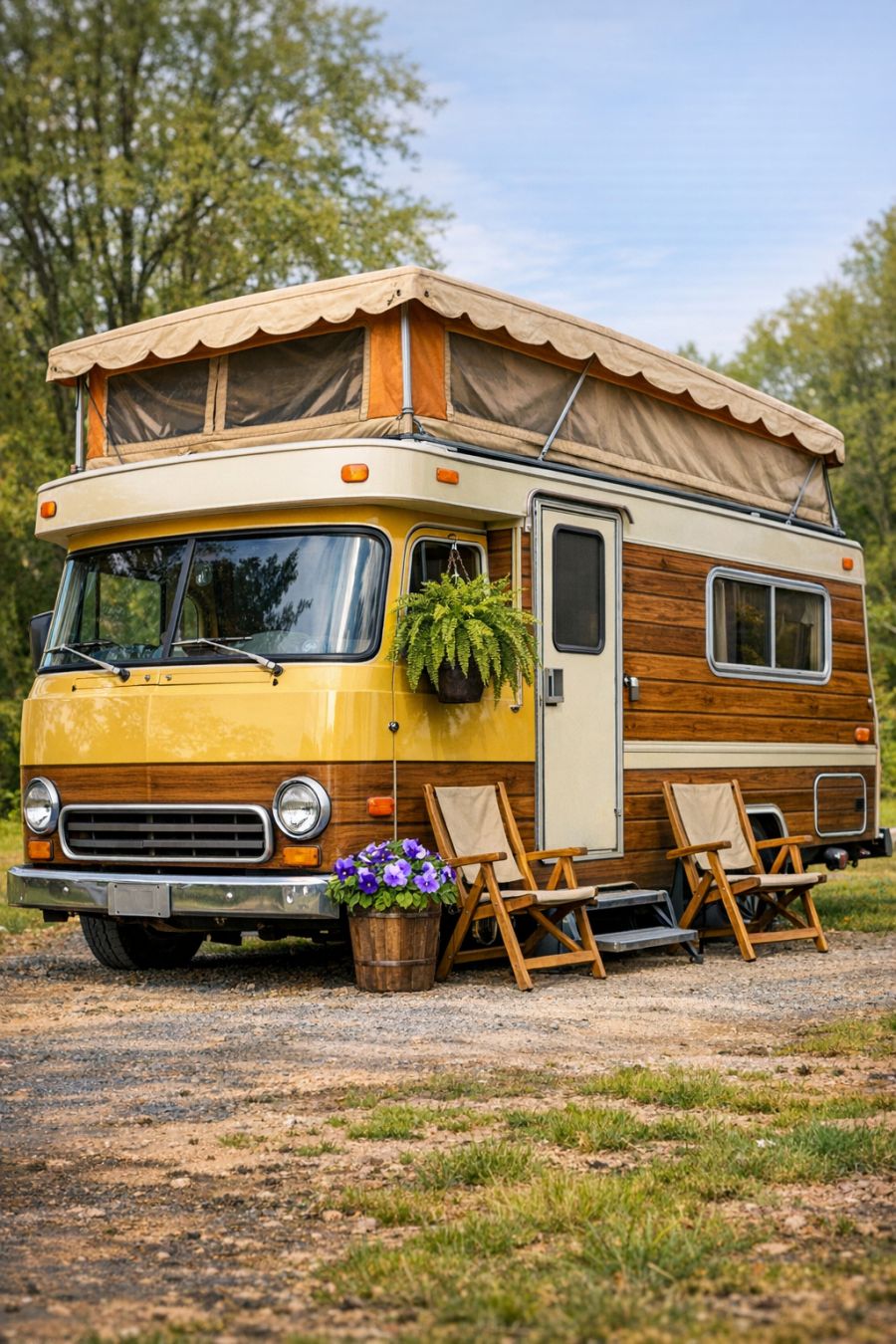 The exterior of this vintage RV camper is a delightful blend of mustard yellow and wood-paneled accents, capturing the eye with its warm, inviting hues. The retro canvas pop-up canopy adds a touch of nostalgia, creating a perfect spot for enjoying the outdoors in style. Flanking the entrance are folding wooden camp chairs, evoking a sense of rustic charm, while hanging green ferns and potted purple pansies by the door add a touch of nature and color. The 3/4 angled view reveals the RV's classic silhouette, making it a picturesque scene straight out of a road trip dream.