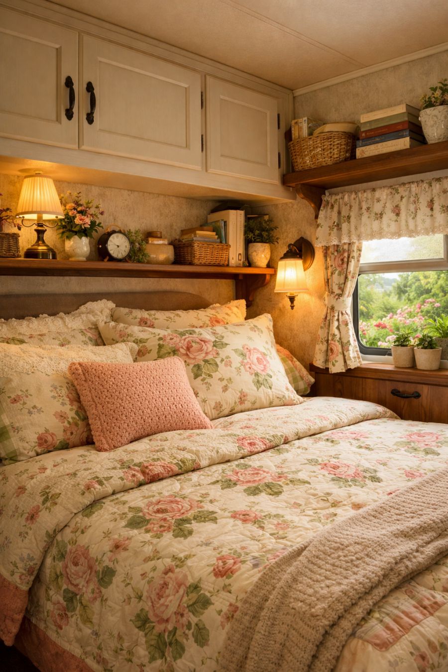 The bedroom area is a cozy nook that offers a serene retreat at the end of a long day. The bed is dressed in soft, vintage-inspired linens with floral patterns that echo the colors of the exterior garden. Clever use of space is evident in the built-in storage compartments and shelves, which keep personal items neatly organized. Soft lighting creates a calming ambiance, while a small window lets in natural light and provides a view of the surrounding landscape. It's a peaceful haven that combines old-world charm with the comforts of modern living.