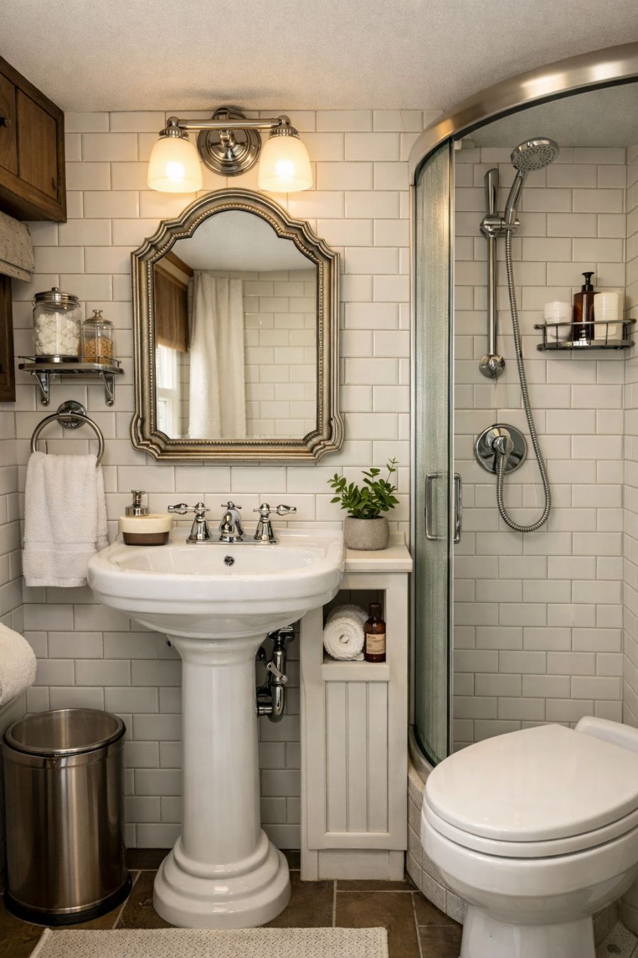 The bathroom area is a study in efficient design, combining style and functionality in a compact space. The walls are adorned with classic subway tiles in a soothing, neutral palette, creating a clean and timeless look. A small but elegant pedestal sink offers practicality without sacrificing style, while a vintage-style mirror adds a touch of glamour. Fixtures are chosen for their retro appeal, yet they function with modern efficiency. The layout is cleverly arranged to maximize space, ensuring that everything you need is within easy reach, while maintaining an airy, uncluttered feel.