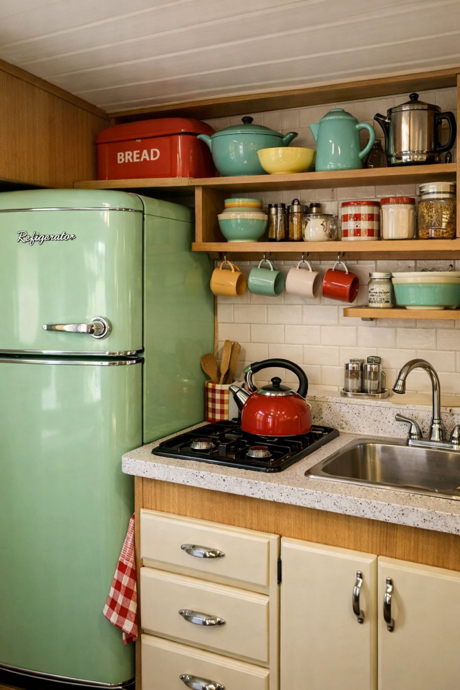 The kitchen area, though compact, is a marvel of efficiency and style. A retro-style refrigerator, painted in a matching mint green, stands proudly against one wall, providing ample space for essentials. The countertops are crafted from a durable material that mimics the look of classic Formica, offering a nod to the past while ensuring modern practicality. Open shelving displays a charming collection of vintage cookware, while a small but functional stovetop and sink complete the setup. This kitchen is a nostalgic dream, perfect for whipping up meals on the go.