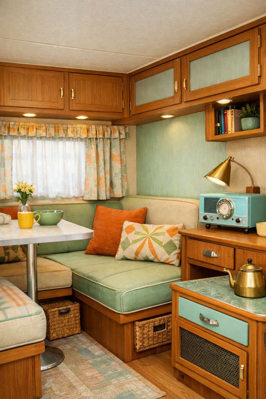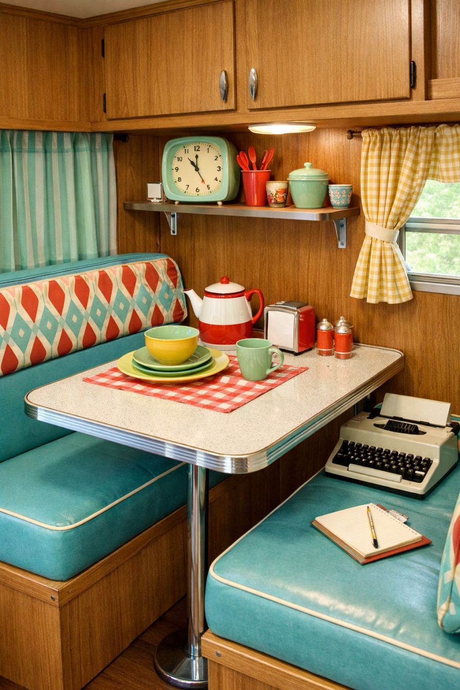 The dining area is a testament to the elegance of simplicity, with a small, fold-out table that echoes the aesthetic of the 1950s dinette sets. It is surrounded by two compact yet comfortable benches that are upholstered in a cheerful, patterned fabric, reminiscent of classic diner booths. The use of space is ingenious, as the dining area seamlessly transitions into a workspace if needed. Vintage-inspired dishware and accessories add a touch of whimsy, making every meal feel like a special occasion.