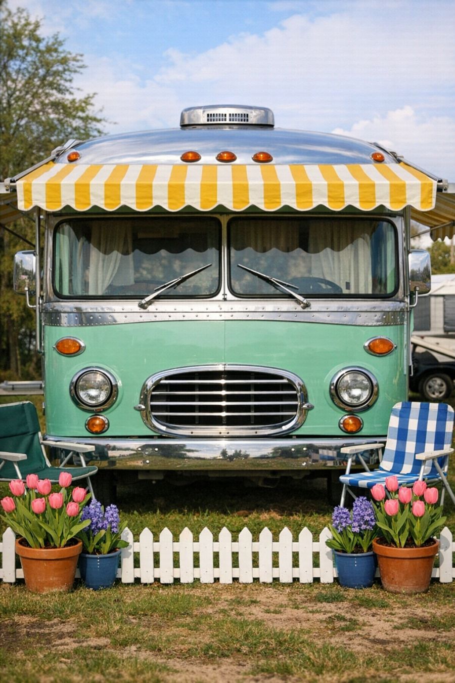 The exterior of this mint green vintage RV camper is a visual delight, drawing inspiration from classic retro styles. Its body gleams with polished aluminum detailing, catching the light in a way that highlights its well-maintained charm. A yellow and white striped rollout awning extends gracefully, providing shade and enhancing the camper's nostalgic appeal. The scene is completed by a miniature white wood picket fence that borders the camper, featuring potted pink tulips and hyacinths, adding a splash of color and warmth. Camping chairs are set up on the grassy patch beside it, inviting relaxation and outdoor enjoyment, all captured in an amateur photograph that exudes authenticity.