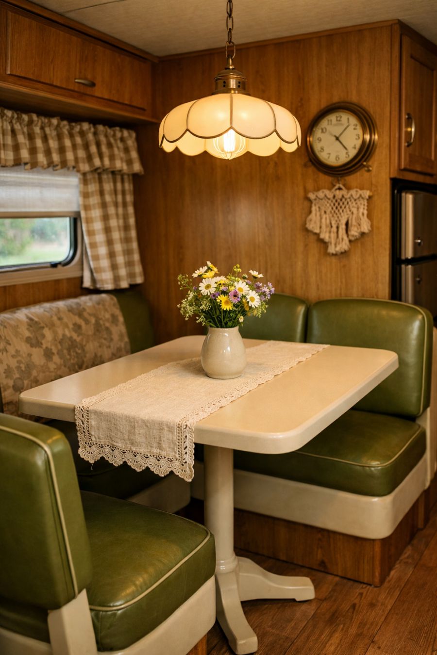 Adjacent to the living area, the dining space is a charming nook that perfectly complements the vintage aesthetic. A petite cream-colored table sits gracefully in the center, surrounded by coordinating olive green chairs that invite you to enjoy a meal in style. The table is adorned with a simple yet elegant table runner and a small vase of fresh wildflowers, adding a touch of nature to the setting. Overhead, a retro pendant light casts a warm glow, enhancing the cozy ambiance of this intimate dining area.