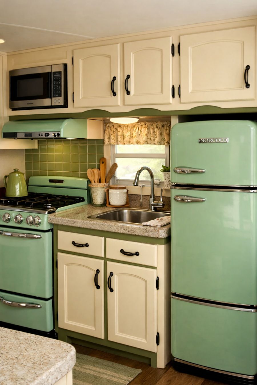 The kitchen area is an exquisite blend of functional design and vintage charm. It features cream-colored cabinetry with delicate olive green accents, providing ample storage space while maintaining the camper's cohesive color scheme. A retro-style stove and refrigerator add to the nostalgic feel, while modern conveniences such as a compact microwave and efficient sink ensure practicality. The countertops, finished in a durable yet stylish material, offer plenty of space for meal preparation, making this kitchen both beautiful and functional.