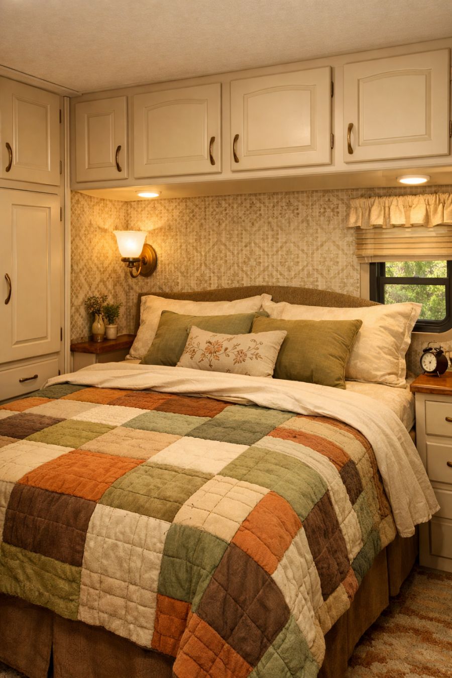 In the bedroom area, vintage elegance meets comfort with a plush mattress dressed in soft linens and a quilt that features an array of soothing earth tones. The walls are adorned with subtle retro patterns that add depth and character to the space. Built-in storage solutions provide ample room for clothing and personal items, cleverly hidden behind cream-colored panels that blend seamlessly with the overall design. A small window allows natural light to flood the space, creating a serene and restful atmosphere perfect for rejuvenation.