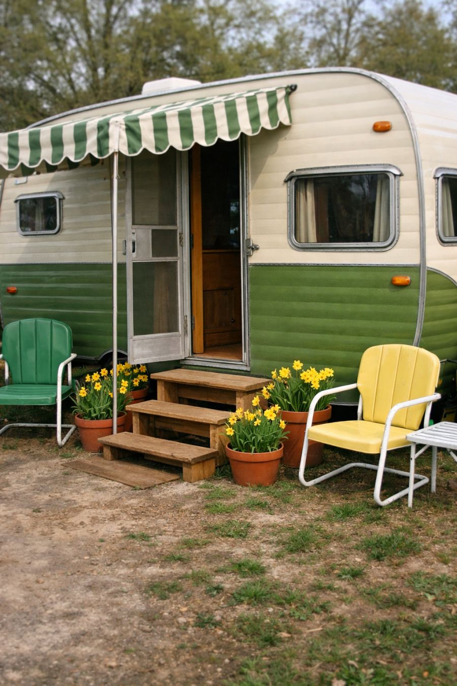 The exterior of this vintage RV camper is a delightful sight with its striking olive green and cream color palette. The nostalgic hues instantly transport you to a bygone era, while the striped canvas awning adds a touch of classic elegance. Carefully placed around the wooden entry steps, potted yellow daffodils brighten the scene, offering a warm and welcoming feel. Completing the picturesque setup are retro metal lawn chairs, inviting you to sit back and enjoy the view, all captured through the lens of amateur photography that perfectly captures the home's quaint charm.