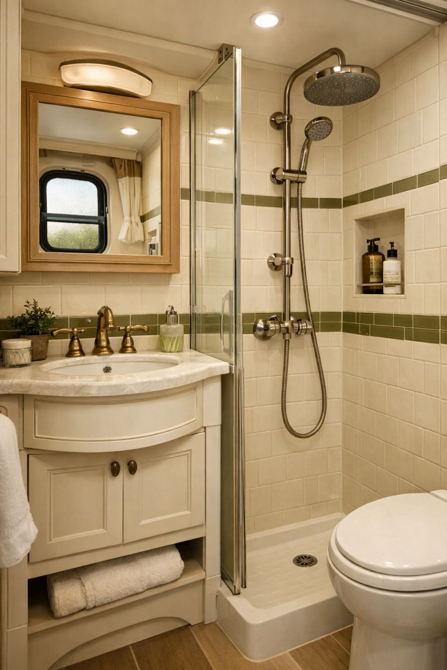 The bathroom area is a masterclass in compact design, offering all the essentials within a beautifully styled space. Cream-colored tiles line the walls, accented by olive green borders that tie the design together. A vintage-style sink and faucet sit atop a petite vanity, offering both function and charm. The shower area is efficiently designed, with sleek fixtures and a showerhead that provides a luxurious bathing experience. Despite its compact size, the bathroom feels open and airy, thanks to clever use of mirrors and natural light.