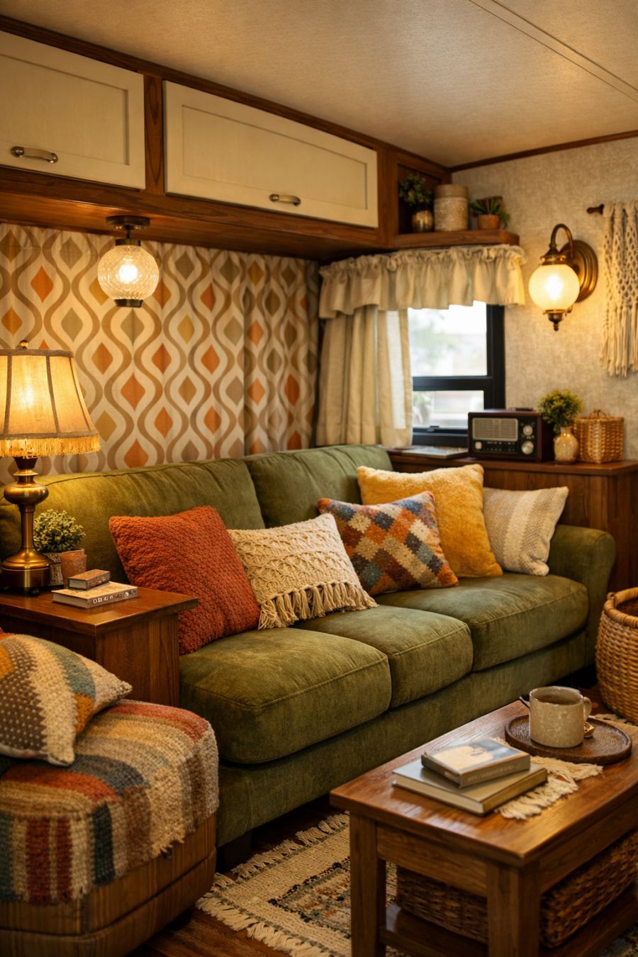 Step inside, and you're greeted by a living area that exudes vintage coziness with modern flair. The walls are adorned with a blend of retro wallpaper and cream accents, creating a warm and inviting atmosphere. A plush olive green sofa takes center stage, complemented by a collection of eclectic throw pillows that add pops of color and texture. The space is illuminated by a combination of natural light streaming through the windows and carefully chosen vintage light fixtures that offer a soft, ambient glow.