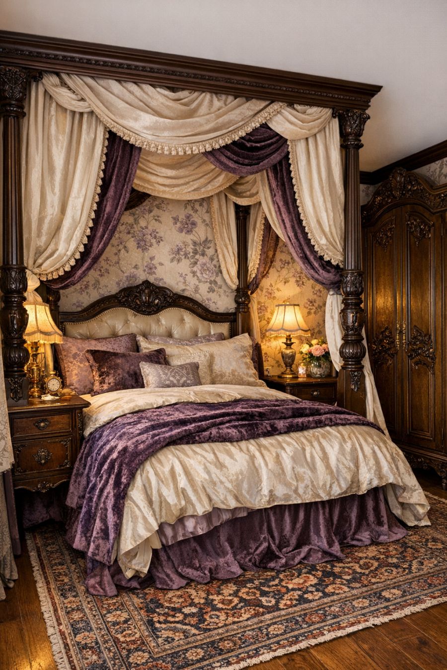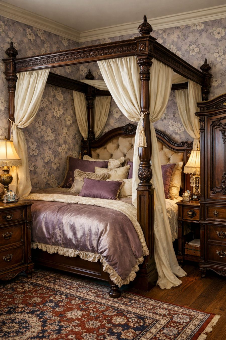 The bedroom is a serene retreat, where Victorian opulence meets modern comfort. A grand four-poster bed, draped in sumptuous silk and velvet, serves as the centerpiece of the room. Delicate floral wallpaper in calming hues of lavender and cream creates a soothing atmosphere, while antique bedside tables provide space for personal effects. An intricately carved wardrobe offers ample storage, and a plush Persian rug underfoot adds a layer of warmth and luxury to the space.