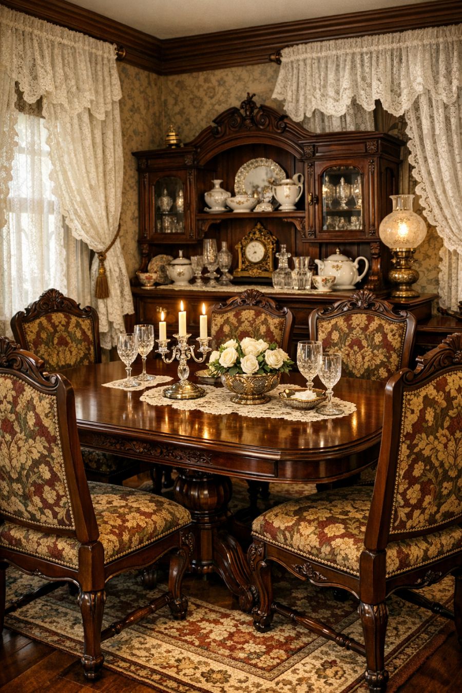 The dining area continues the Victorian theme with a beautifully crafted mahogany table that comfortably seats six. High-backed chairs upholstered in rich tapestry fabric encircle the table, offering both comfort and style. Delicate lace curtains frame the windows, allowing soft, natural light to filter in and illuminate the intricate patterns of the room. A vintage sideboard, adorned with fine china and crystal glassware, exudes a sense of timeless sophistication, making the dining area perfect for hosting intimate gatherings.