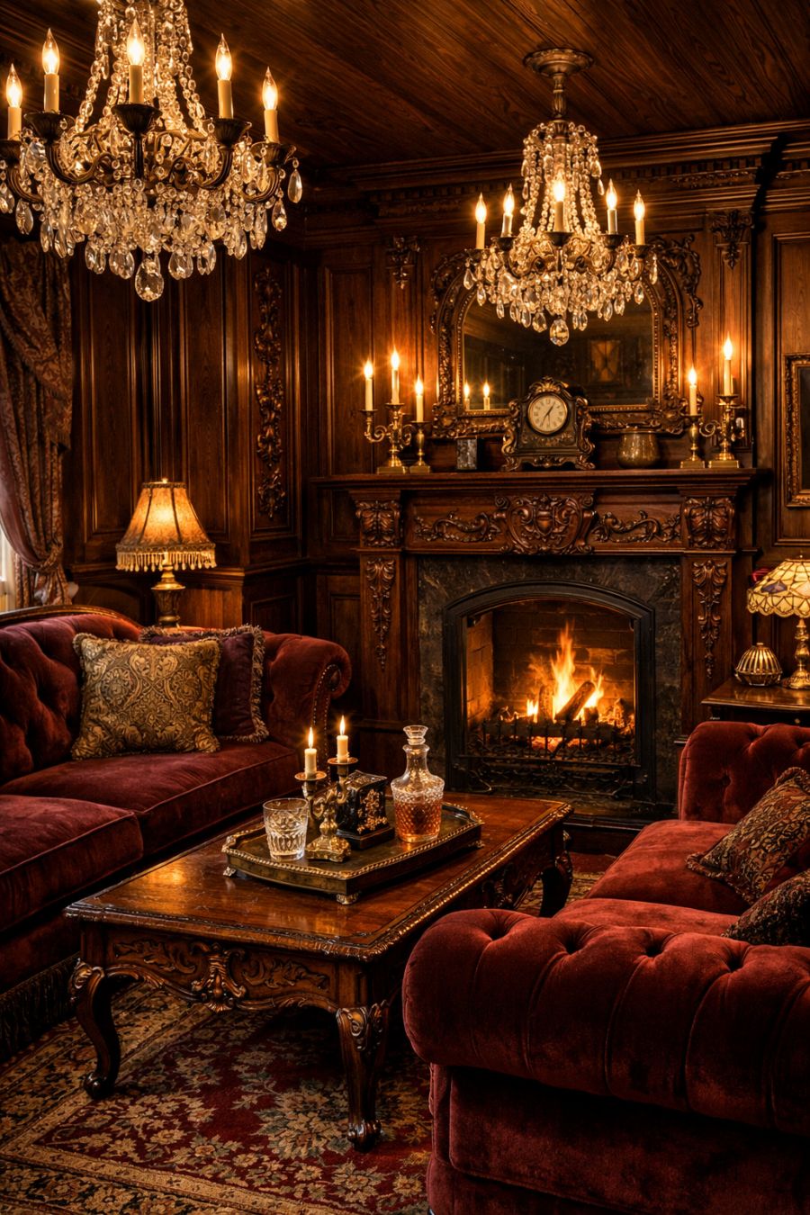 Stepping inside, the living area reveals an opulent Victorian parlor that feels worlds away from the unassuming exterior. Rich, dark wood paneling lines the walls, adorned with intricate carvings and moldings that speak to a bygone era of elegance. Plush velvet sofas in deep burgundy offer luxurious seating, while an ornate fireplace serves as a dramatic focal point. Crystal chandeliers hang from the ceiling, casting a warm, inviting glow across the room and elevating the space with a touch of grandeur.