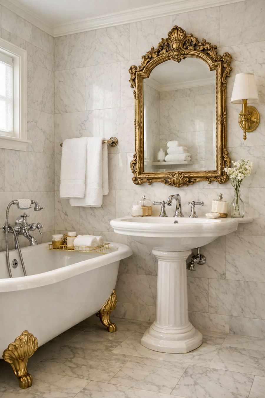 The bathroom is a study in elegance and functionality, where every detail has been thoughtfully considered. Gleaming marble tiles cover the floors and walls, reflecting light and creating a sense of spaciousness. A vintage clawfoot bathtub offers a luxurious spot for relaxation, while a stylish pedestal sink and chrome fixtures add a touch of modernity. The color scheme is a harmonious blend of soft whites and muted golds, creating a calming oasis. An antique mirror with an ornate frame adds a final touch of Victorian charm, completing the bathroom's sophisticated look.