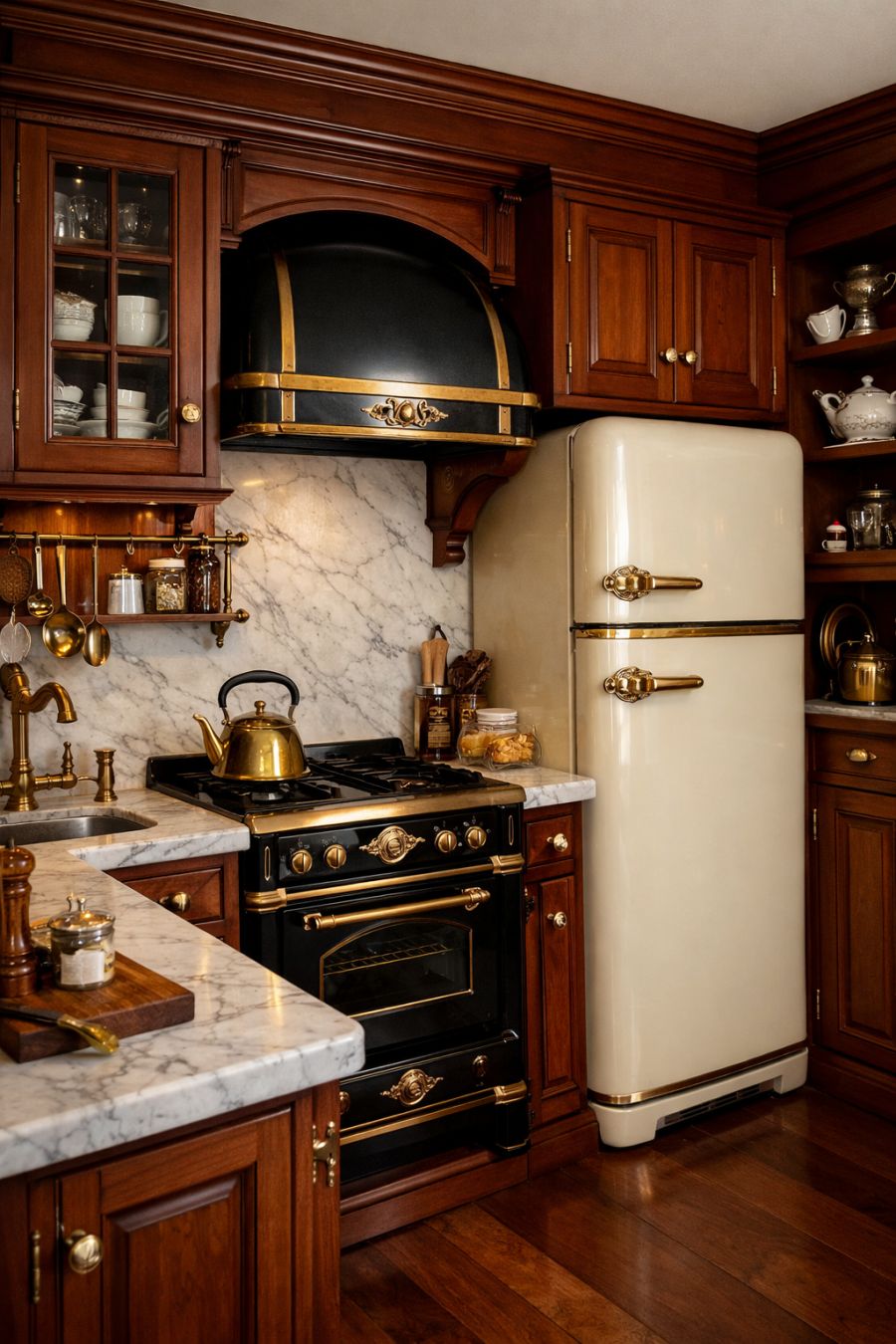 Despite its compact size, the kitchen is a marvel of Victorian-inspired design, seamlessly blending form and function. Custom cabinetry in rich cherry wood provides ample storage, while polished brass hardware adds a touch of elegance. The countertops are crafted from luxurious marble, offering a durable and stylish workspace. A vintage-style stove and refrigerator, with their classic lines and ornate detailing, complete the look, making the kitchen a charming yet practical space for culinary endeavors.