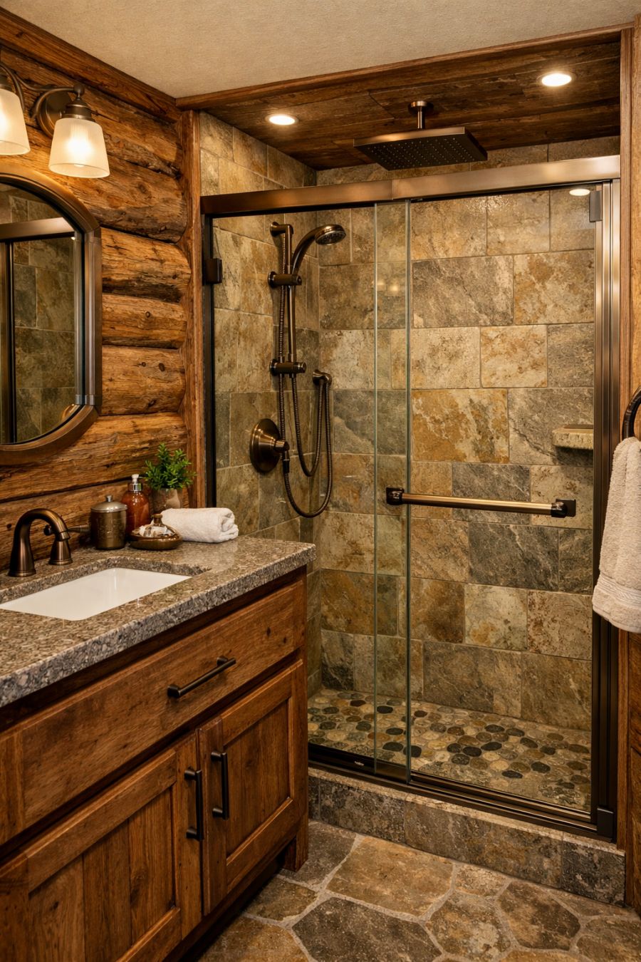The bathroom is a testament to the blend of rustic aesthetics with modern functionality. Rough-hewn timber walls continue the cabin theme, while elegant fixtures in brushed bronze add a touch of sophistication. The centerpiece is a spacious shower with a rainfall showerhead, enclosed in clear glass to maintain a sense of openness. Natural stone tiles line the floor, providing a tactile connection to the earth, while a wooden vanity with a sleek stone countertop offers ample space for personal items. The design emphasizes a harmonious balance between traditional charm and contemporary comfort, creating a serene oasis within the RV.