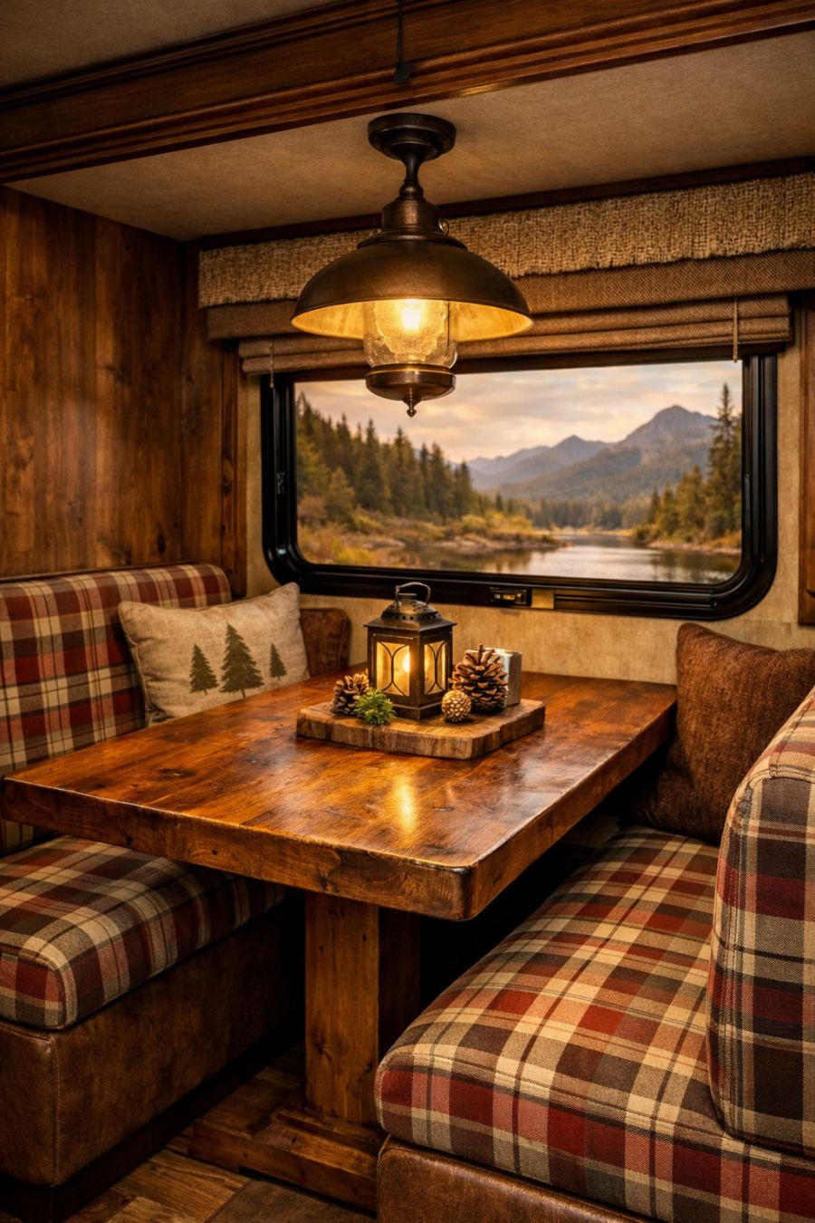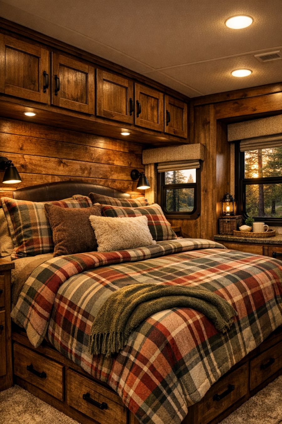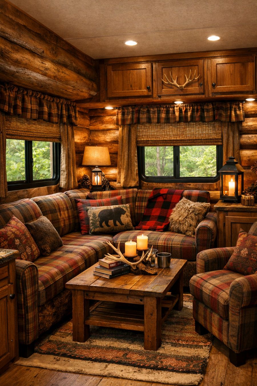 Step inside, and you'll find a living area that defies the typical expectations of an RV interior. The space is enveloped in rustic log cabin aesthetics, with rough-hewn timber walls that exude warmth and a connection to nature. The furnishings continue this theme, featuring plaid wool fabrics in rich, earthy tones, enhancing the cozy woodland haven vibe. Soft lighting filters through the windows, complementing the natural textures and creating an inviting atmosphere that's perfect for unwinding after a day of exploration. The living area seamlessly blends practicality with style, offering plush seating arrangements that encourage relaxation.
