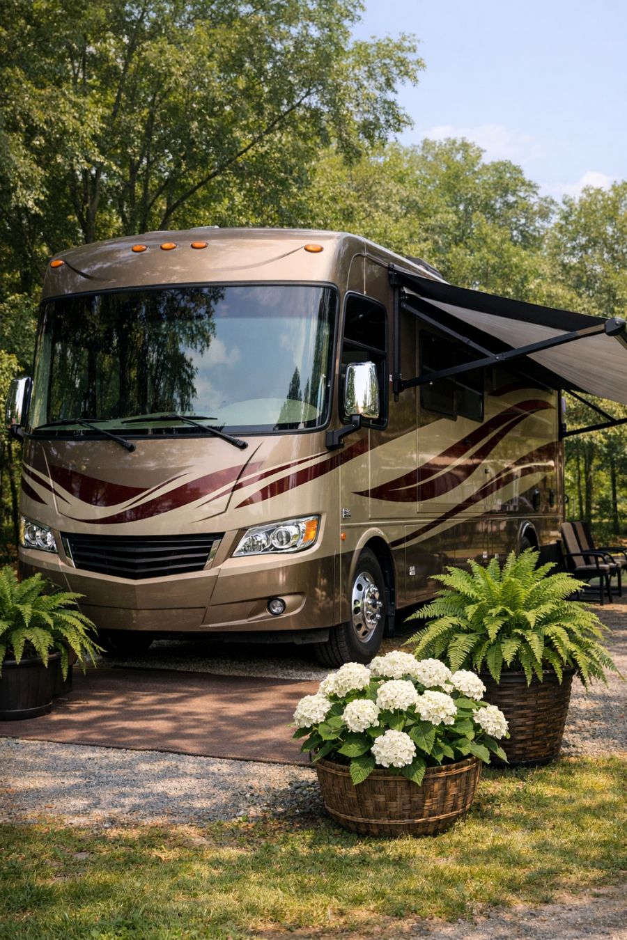 The exterior of this Class A RV camper is a testament to modern motorhome design, with its massive, glossy tan fiberglass body elegantly accented by sweeping maroon swoosh decals that add a touch of sophistication and movement. The vehicle is equipped with a large, extended awning, perfect for creating an outdoor living space that invites relaxation amid the great outdoors. Adding to the charm, the RV is surrounded by lush green potted ferns and blooming white hydrangeas, creating a serene and inviting ambiance. This amateur photographic capture at a 3/4 angle highlights the RV's grand presence, promising a glimpse into the luxurious experience within.